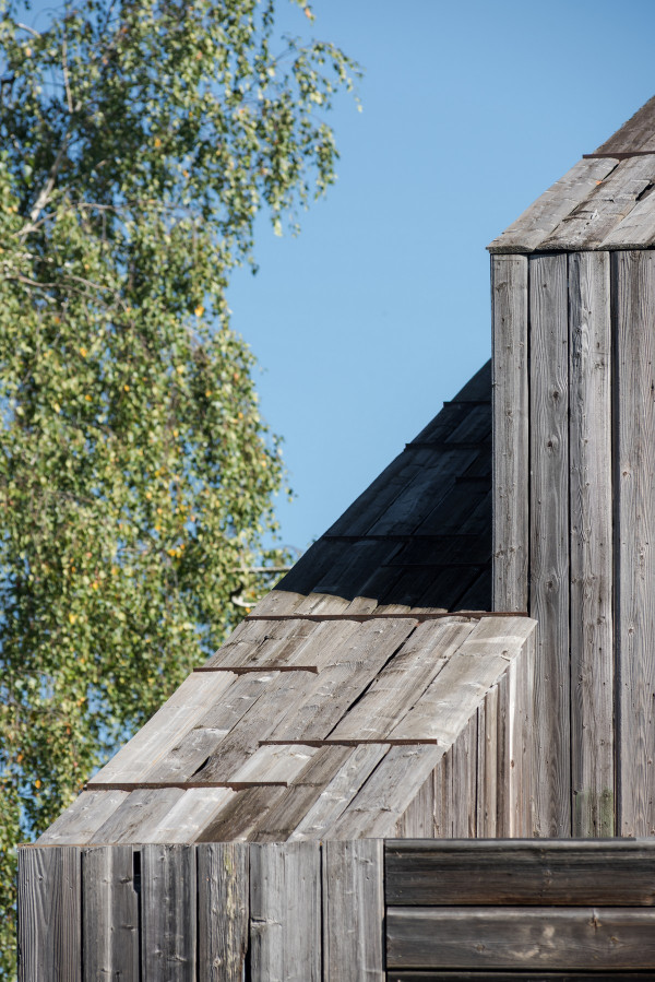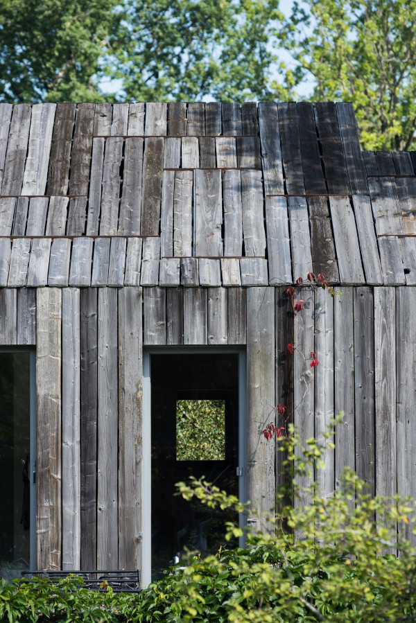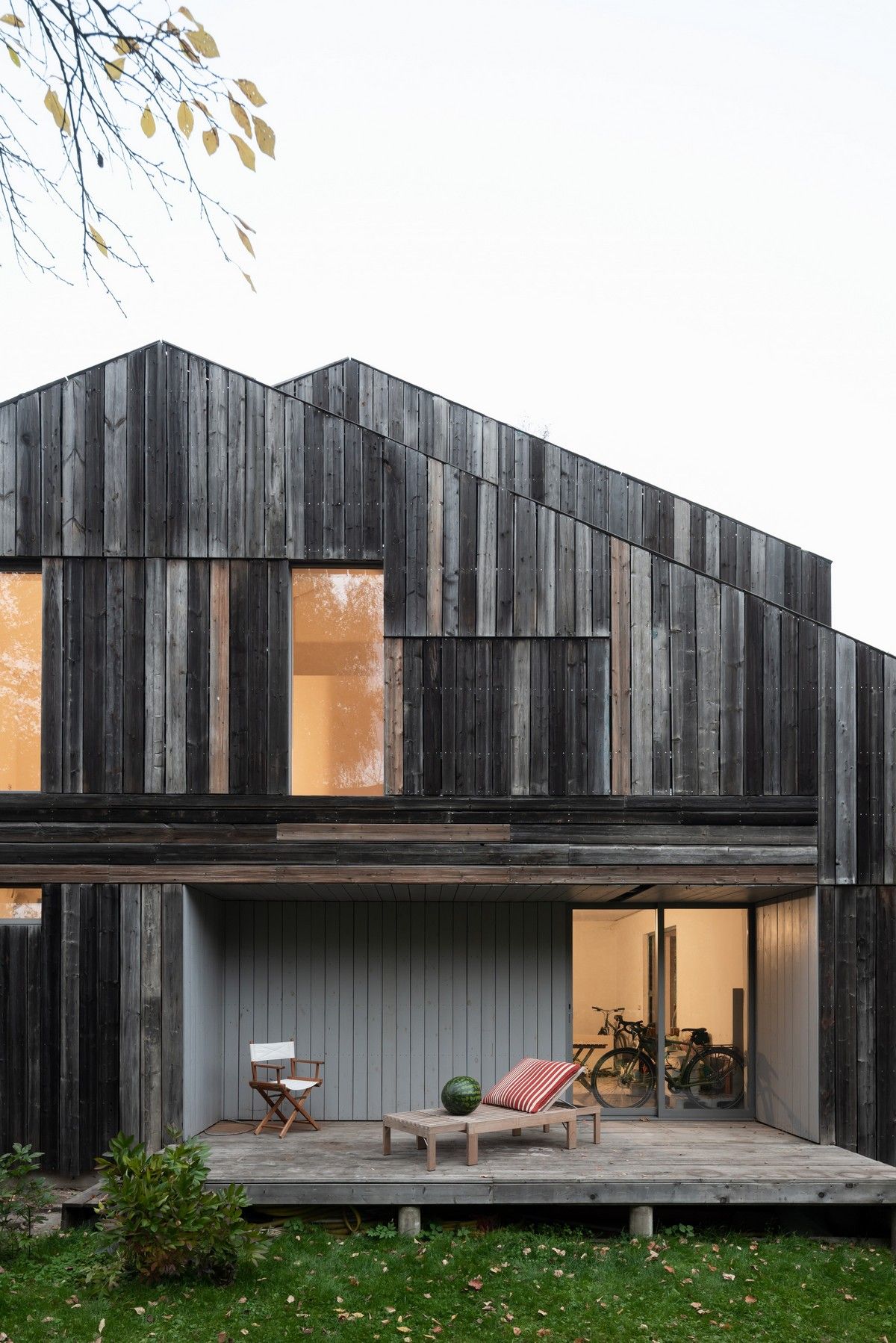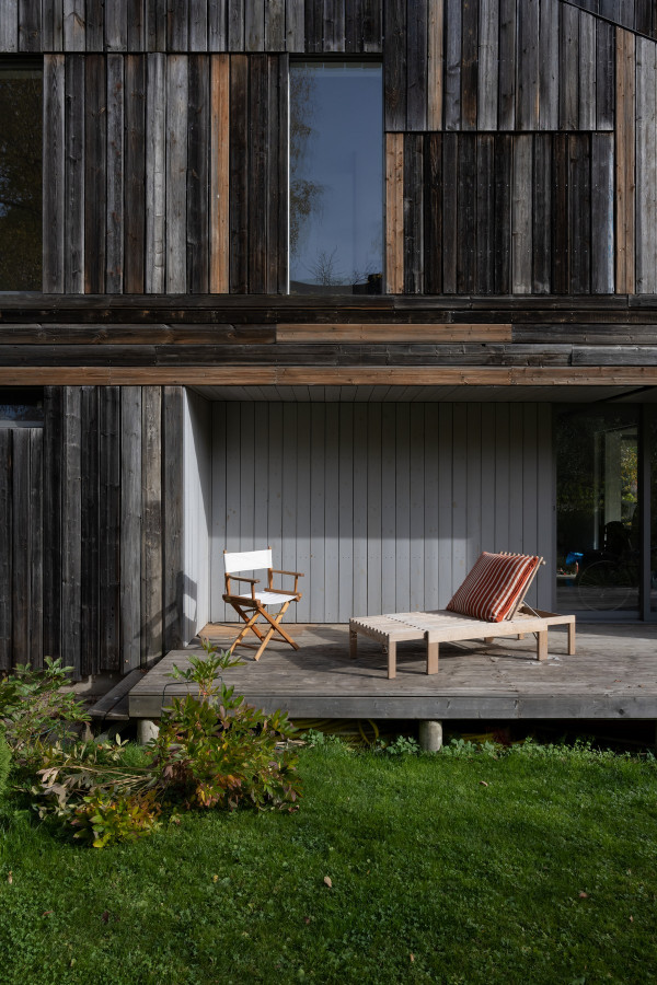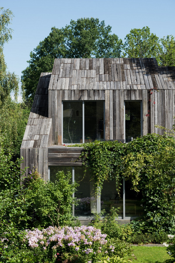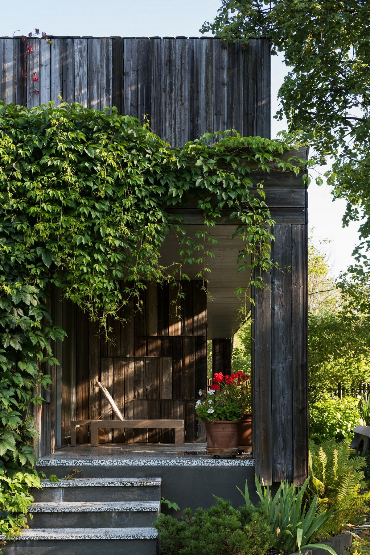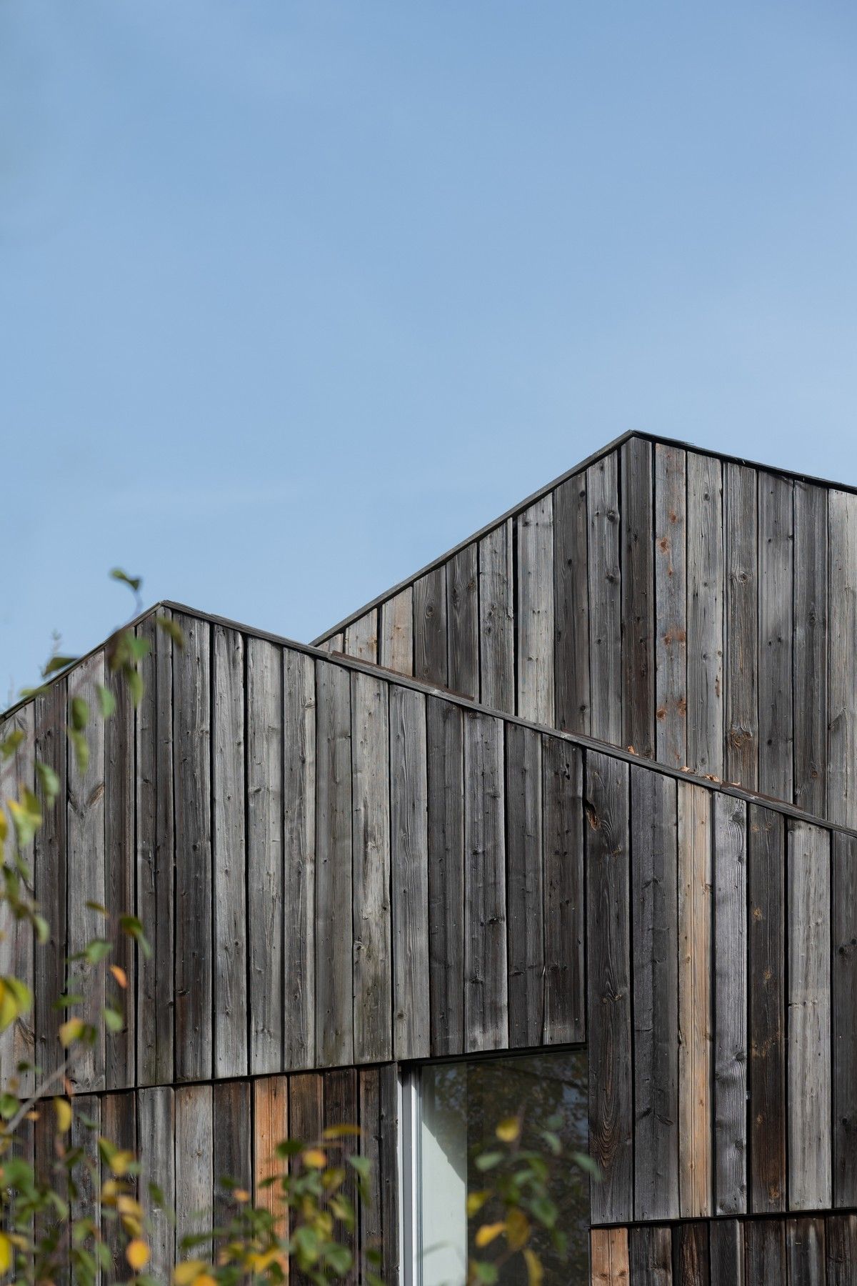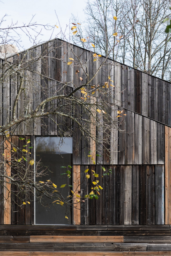 Простота и глубина сложившегося посёлка в пригороде Москвы притягивала своей гармонией и однородностью. Применение на фасаде дома вторичной доски столетнего возраста, привезённой с Севера России, скорее, гротеск в стремлении слиться с природой местности, но в реальности это имело нужный эффект.