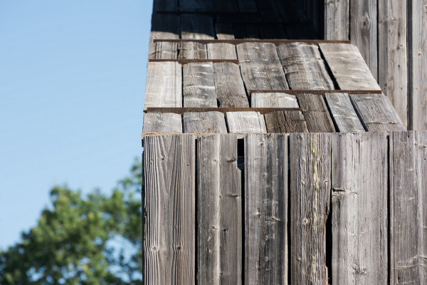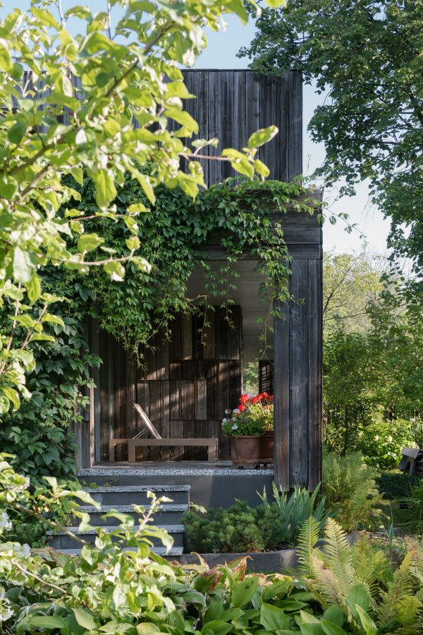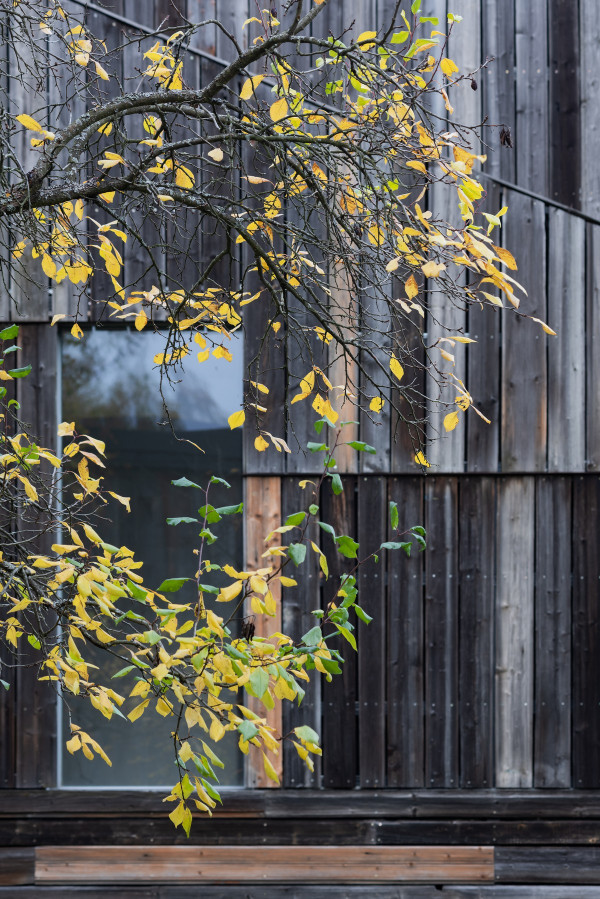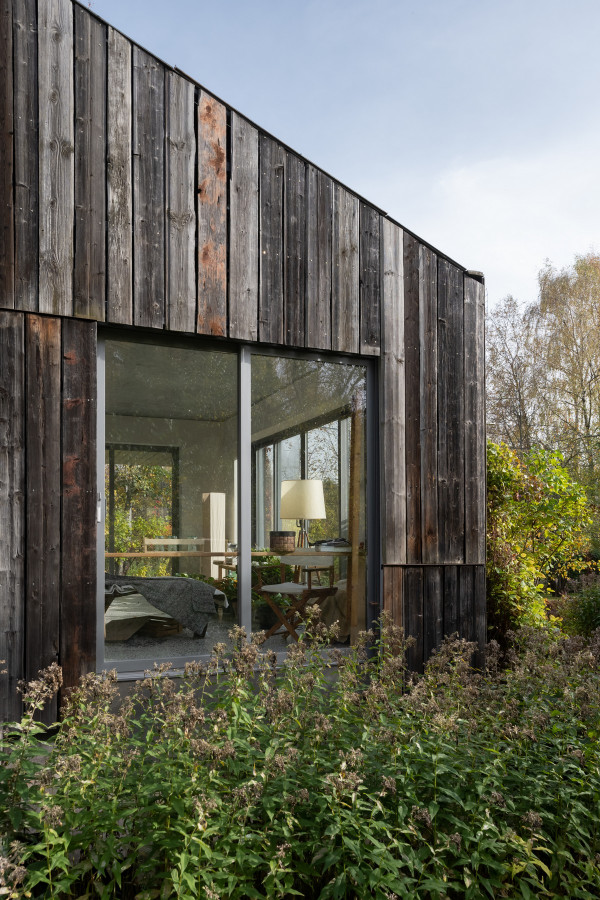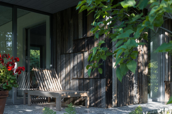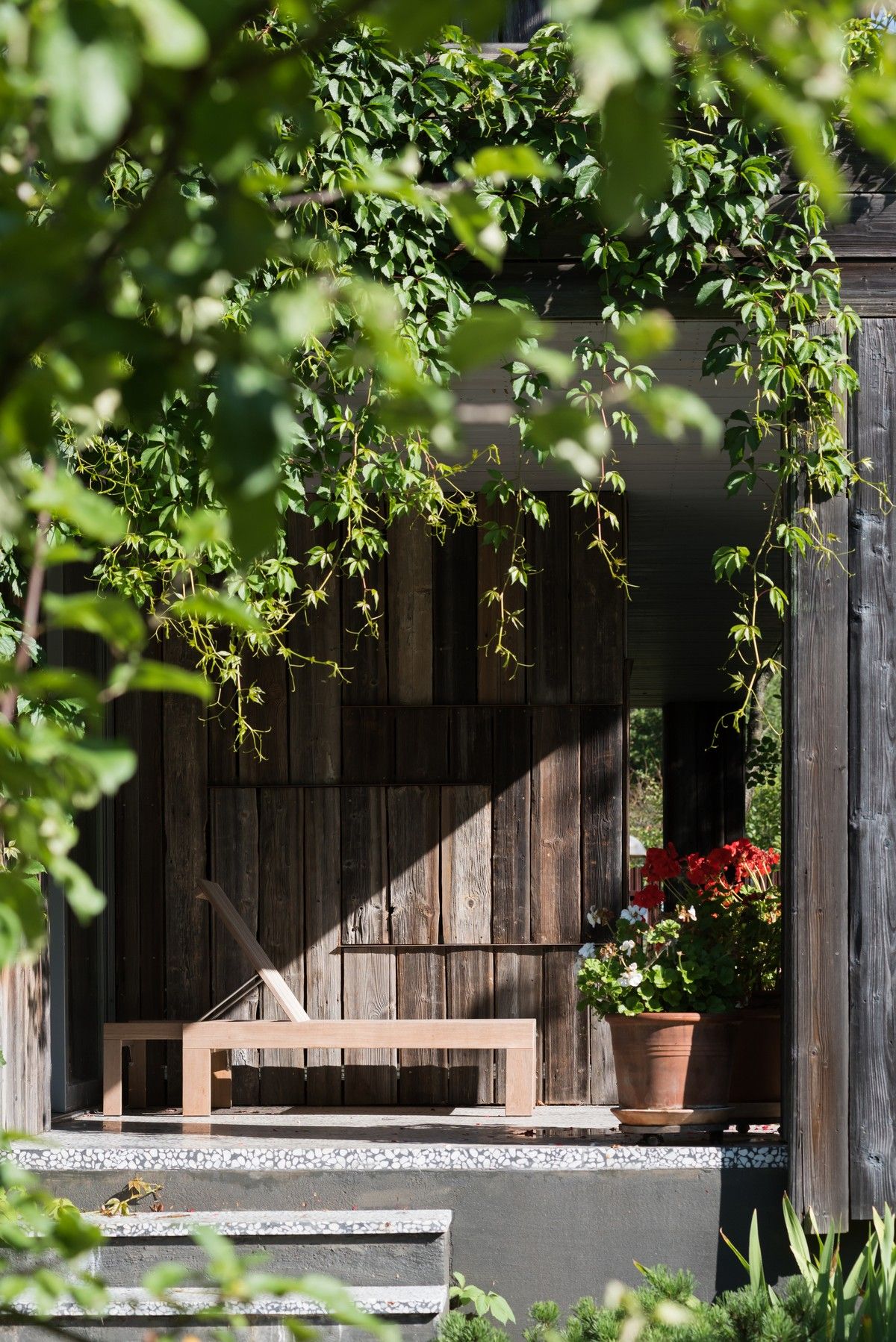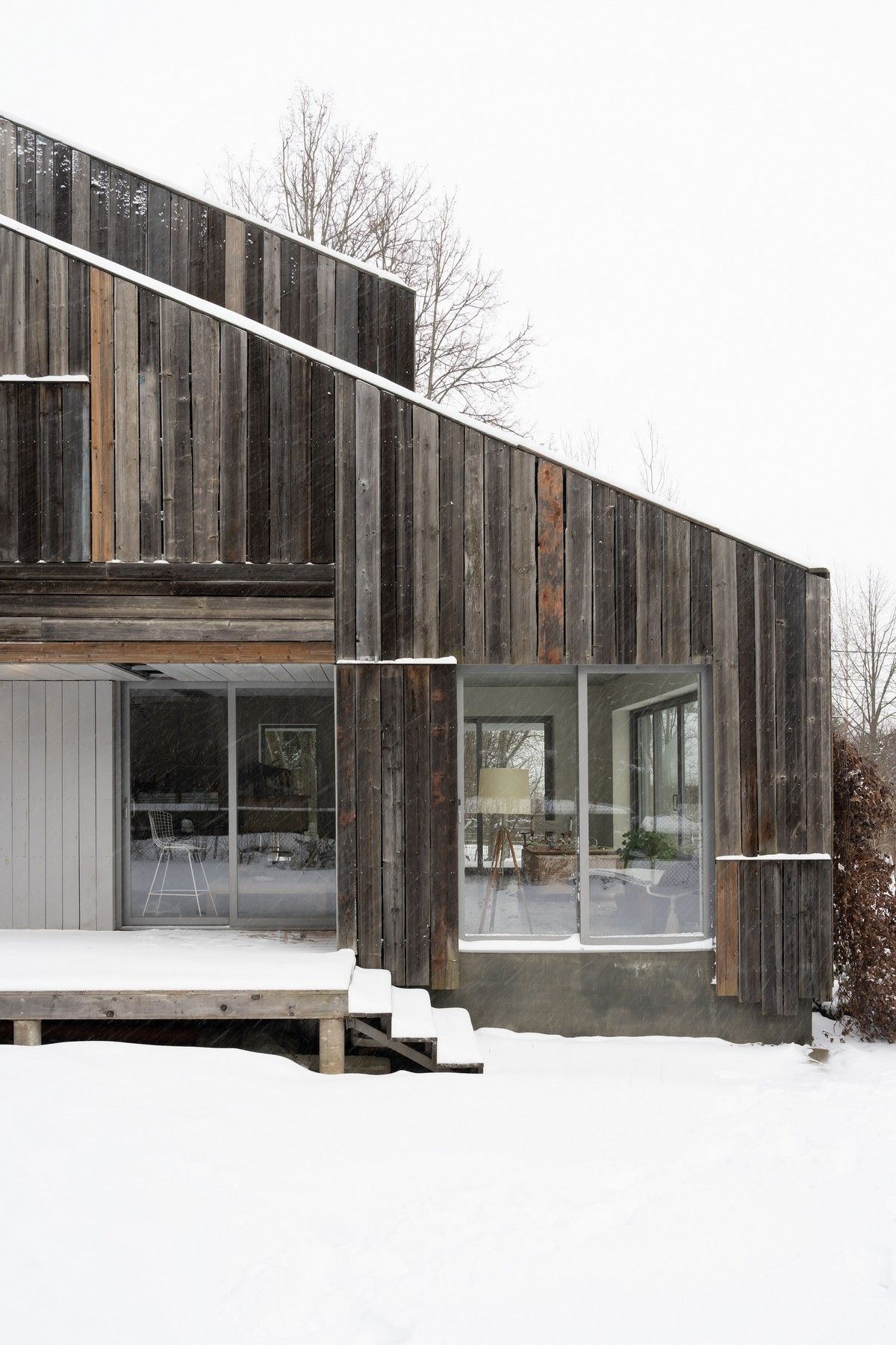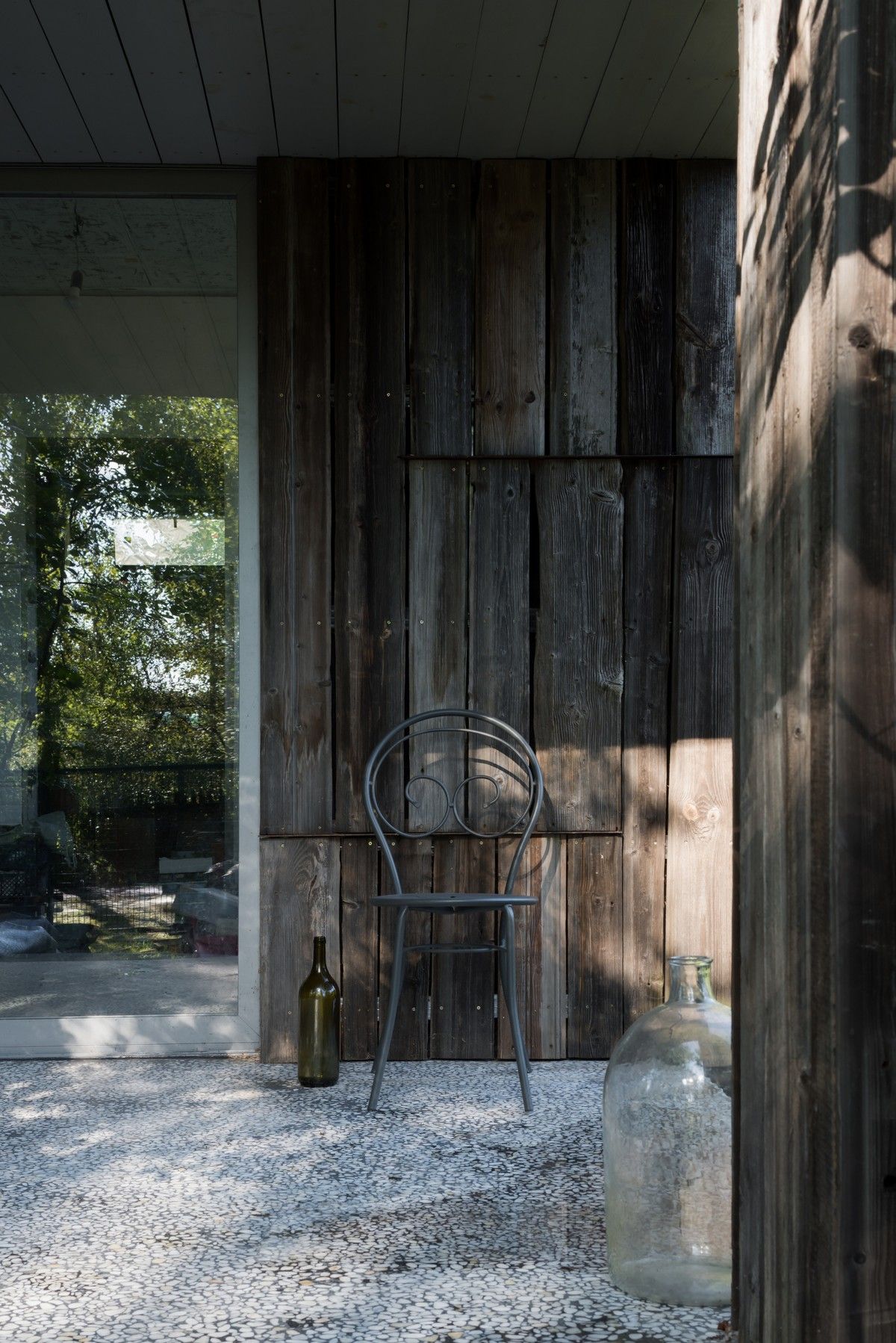 Простота и глубина сложившегося посёлка в пригороде Москвы притягивала своей гармонией и однородностью. Применение на фасаде дома вторичной доски столетнего возраста, привезённой с Севера России, скорее, гротеск в стремлении слиться с природой местности, но в реальности это имело нужный эффект.