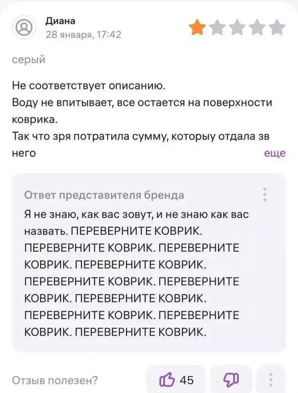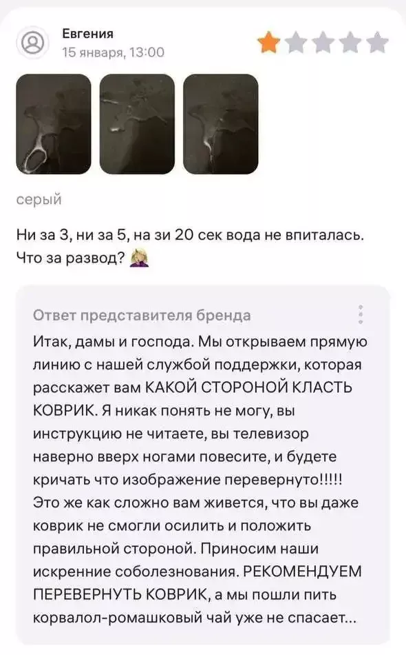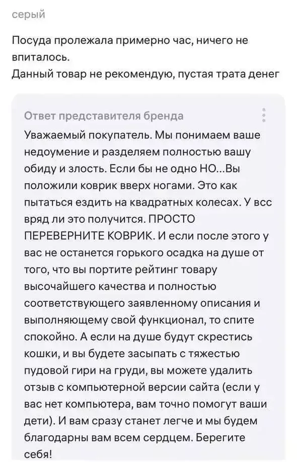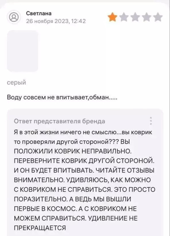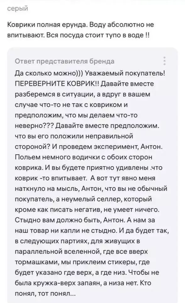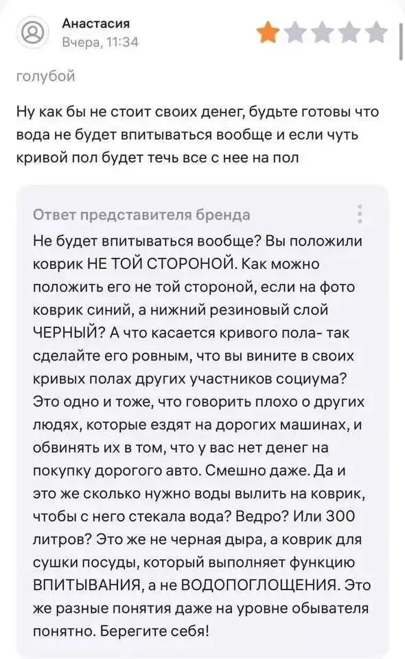 Конфликт на Wildberries начался с потока жалоб от пользователей на неспособность ковриков впитывать влагу. Не выдержав напора недовольных клиентов, продавец, который сначала поддерживал вежливый тон, в конце концов сорвался.