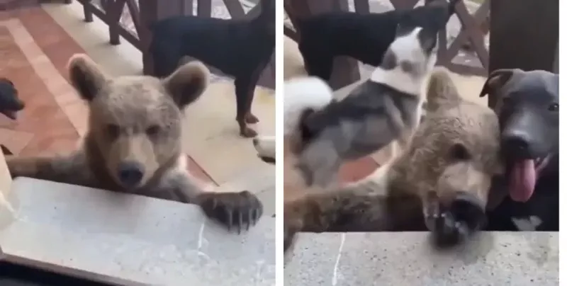 Лесной житель пытался удачно "затесаться" между собак, но некоторые из них решили "убрать" своего конкурента. Несмотря на тщетные попытки вытеснить медведя из окна, ему удалось дождаться своего угощения.