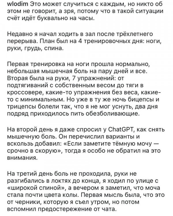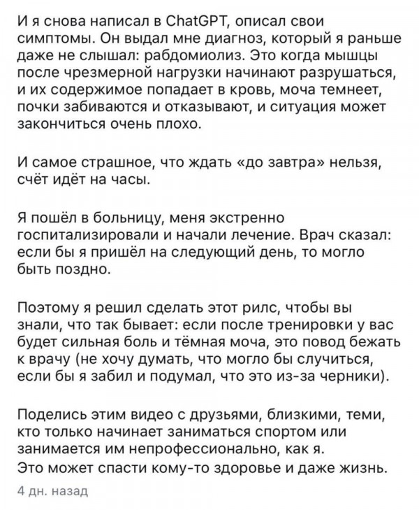 Он обратился к нейросети за советом, и та предупредила: если появится тёмная моча, нужно срочно ехать к врачам. В итоге симптом действительно проявился, и ChatGPT подсказал возможный диагноз - рабдомиолиз, опасное разрушение мышц, способное вызвать отказ почек.Медики подтвердили, что промедление могло стоить жизни.