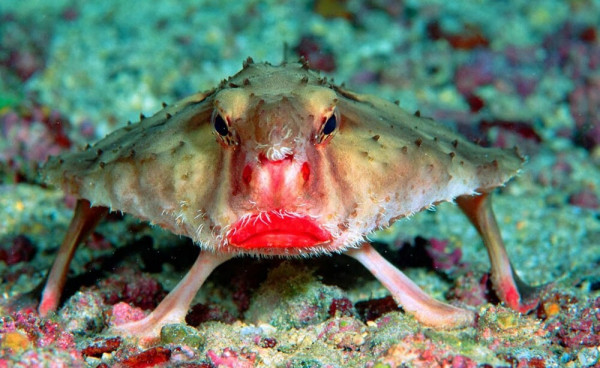 нетопырь Дарвина. Его главная особенность - ярко-красные губы, очень похожие на человеческие. Благодаря этой детали рыба кажется будто накрашенной и выглядит так, словно вышла с карнавала. Учёные до сих пор спорят, зачем нужны такие губы. Одни считают, что для привлечения партнёра, другие - что это маскировка среди кораллов и водорослей.В отличие от большинства рыб, нетопырь плохо плавает. Его плавники превратились в своеобразные "лапки", с помощью которых он "ходит" по дну, переваливаясь с боку на бок. Это выглядит нелепо и забавно, но именно так он охотится на мелкую рыбу, рачков и червей.Нетопырь ведёт малоподвижный образ жизни, предпочитая подстерегать жертву, а не активно плавать за ней. При этом он может изменять цвет кожи в зависимости от фона, что помогает скрываться от хищников