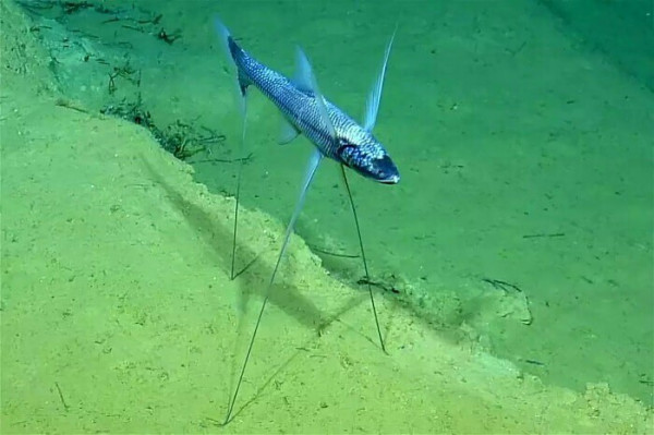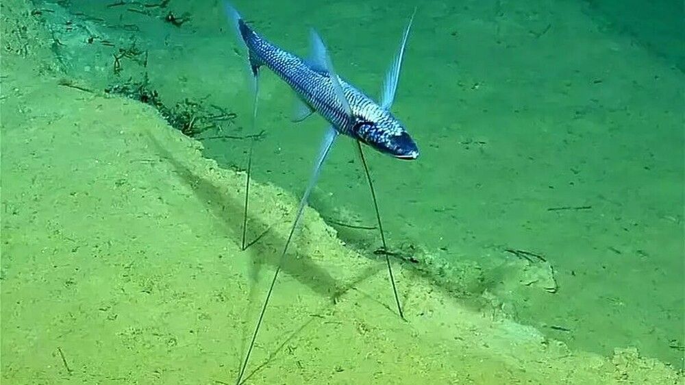 трёхногая рыба. Её внешний вид настолько необычен, что многие дайверы и исследователи сравнивают её с инопланетным существом.Название рыба получила за свою манеру стоять на трёх удлинённых лучах плавников, словно на ножках. Обычно это лучи грудных и брюшных плавников, которые превратились в своеобразные "опоры". Рыба как будто сидит на дне и наблюдает за происходящим.В отличие от большинства рыб, трёхногая почти не плавает. Она ведёт крайне малоподвижный образ жизни, экономя энергию. В условиях глубин, где мало пищи, такая стратегия помогает выживать. Её охота основана на терпении: рыба неподвижно ждёт, пока мимо не проплывёт планктон или мелкое животное, и только тогда резко хватает его.Зрение у трёхногих рыб слабое, что объясняется темнотой на больших глубинах. Зато у них отлично развито обоняние и боковая линия, чувствительная к колебаниям воды. Это помогает им ориентироваться в пространстве и находить добычу.