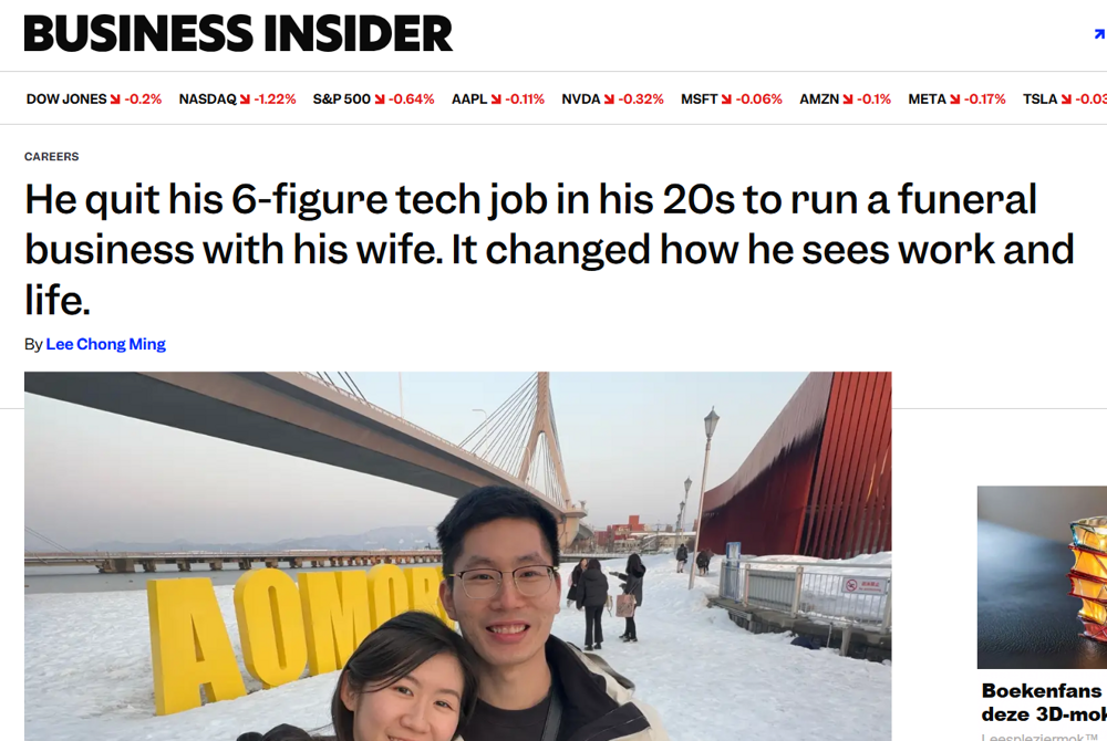 Нашего героя зовут Леон Лим, ему 29 лет, и он один из тех, кто ворвался в похоронную индустрию с энергией новатора. В 2020 году он присоединился к государственному технологическому агентству, специализирующемуся на кибербезопасности. Через четыре года он начал получать шестизначную зарплату и был готов занять руководящую должность. Однако в 2024 году выгорание накрыло его как лавина: усталость, цинизм, ощущение, что жизнь проходит мимо. В какой-то момент он понял, что больше не хочет быть винтиком в корпоративной машине.Он уволился, чтобы присоединиться к семейному похоронному бизнесу своей жены в качестве менеджера по развитию.