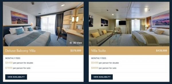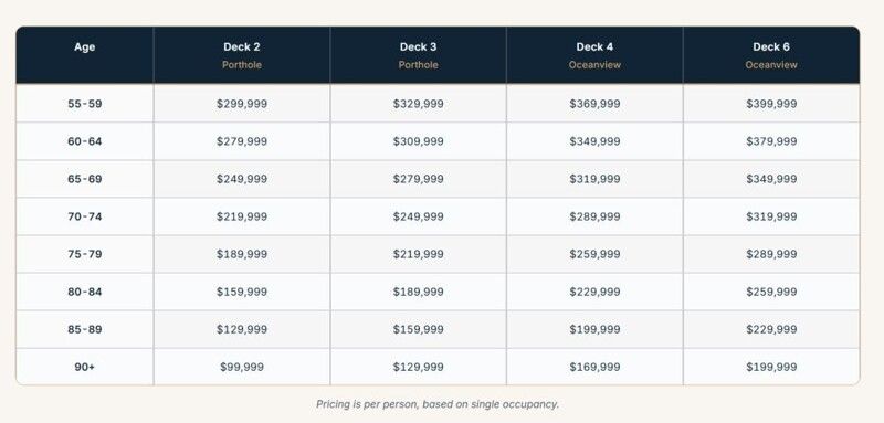 Все начинается с выбора каюты и возраста. Цена зависит от того, сколько вам лет: чем старше, тем дешевле. Для девяностолетних взнос начинается в районе 8 млн рублей за каюту на второй палубе. А для тех, кому пятьдесят пять, придется уже раскошелиться в районе 32 млн рублей.