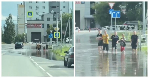 На улице после дождя образовалась огромная лужа, и группа мальчишек решила немного развлечься. Они стояли прямо в воде и терпеливо ждали, пока проедет машина и обрызгает их. Всё происходящее запечатлели девушки на видео - получилось одновременно мило и забавно!