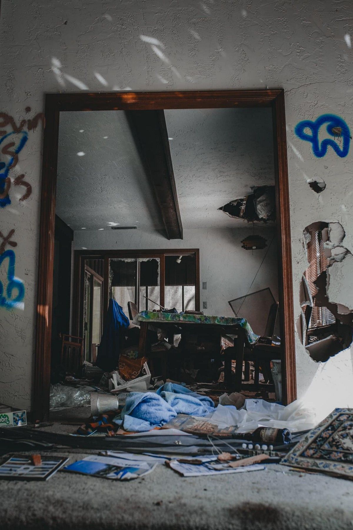 За пределами участка можно заметить "Порше" и "БМВ", припаркованные на том месте, где они, предположительно, были оставлены много лет назад, собирая пыль, когда через механизмы прорастают разросшиеся сорняки.Согласно сообщениям Daily Star, тайна заброшенного "Порше-хауса" поставила в тупик тех, кто знаком с этой собственностью.Фотограф Адам Сконецки, известный под ником @skeezy.explores в Instagram, опубликовал серию фотографий недвижимости, которую, по его словам, он посещал "несколько раз".Жуткие кадры показывают то, что когда-то было семейным домом мечты любого американца.Однако сейчас повсюду разбросаны бумаги и сломанная мебель, покрывающая большую часть здания.Граффити покрывают большую часть стен, многие из которых были пробиты.Снимок того, что когда-то было изготовленным на заказ джакузи, можно увидеть покрытым мусором, хотя его красивая мозаичная работа все еще нетронута.Это место, похоже, было разграблено вандалами, но одежда все еще висит в шкафах; один из немногих признаков дома, которым он когда-то был.На фото, снятом в открытом гараже, изображен "Порше" с разбитыми стеклами и написаными по кузову ругательствами.Участники страницы "Abandoned Beauties" в Facebook обсуждали, почему люди могли уйти, а один пользователь Facebook предположил, что они "участвуют в программе защиты свидетелей".Другой сказал: "100% защита свидетелей или бегство от мафии.""Вероятно, им пришлось бежать от мафии, и теперь они живут в нераскрытом месте и являются членами программы защиты свидетелей, поэтому им приходится скрываться, но я уверен, что они все еще скучают по Порше", - добавил третий.Другие члены клуба, казалось, были очень шокированы и обескуражены ущербом, нанесенным имуществу.