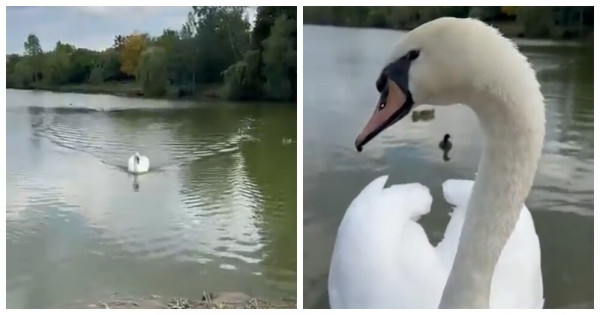 Маленького лебедя нашли и вырастили, а потом выпустили на пруд. Лебедь оказался очень ручным - он подходит к людям по имени, ест с рук и с удовольствием демонстрирует свою красоту.