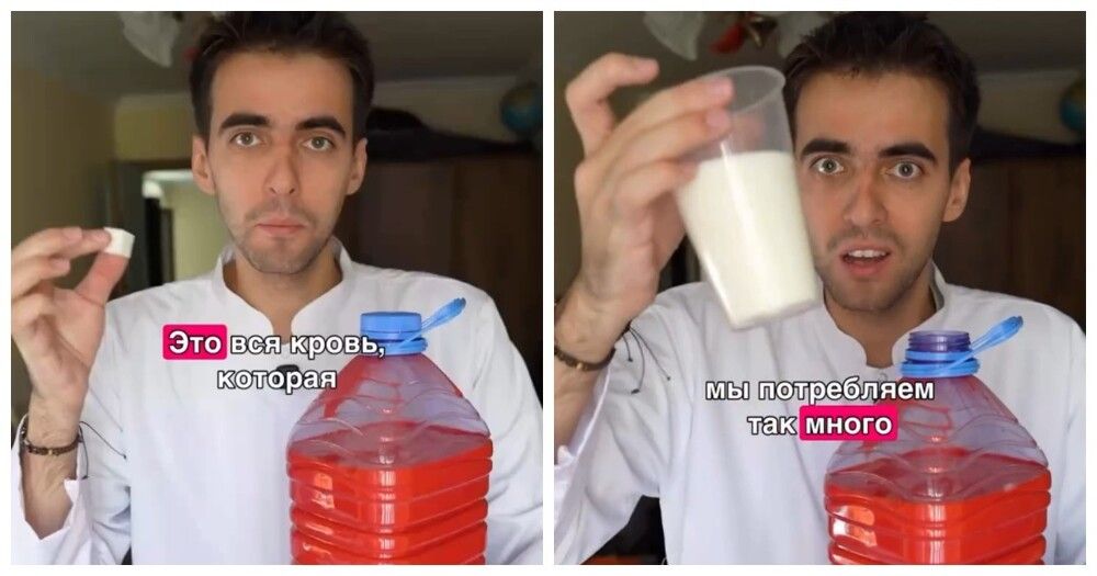 Он продемонстрировал, сколько крови содержится в организме человека и какое количество сахара в ней растворено. По его словам, если ежедневно потреблять примерно 50 чайных ложек сахара, организму приходится вырабатывать инсулин, чтобы привести уровень в норму.