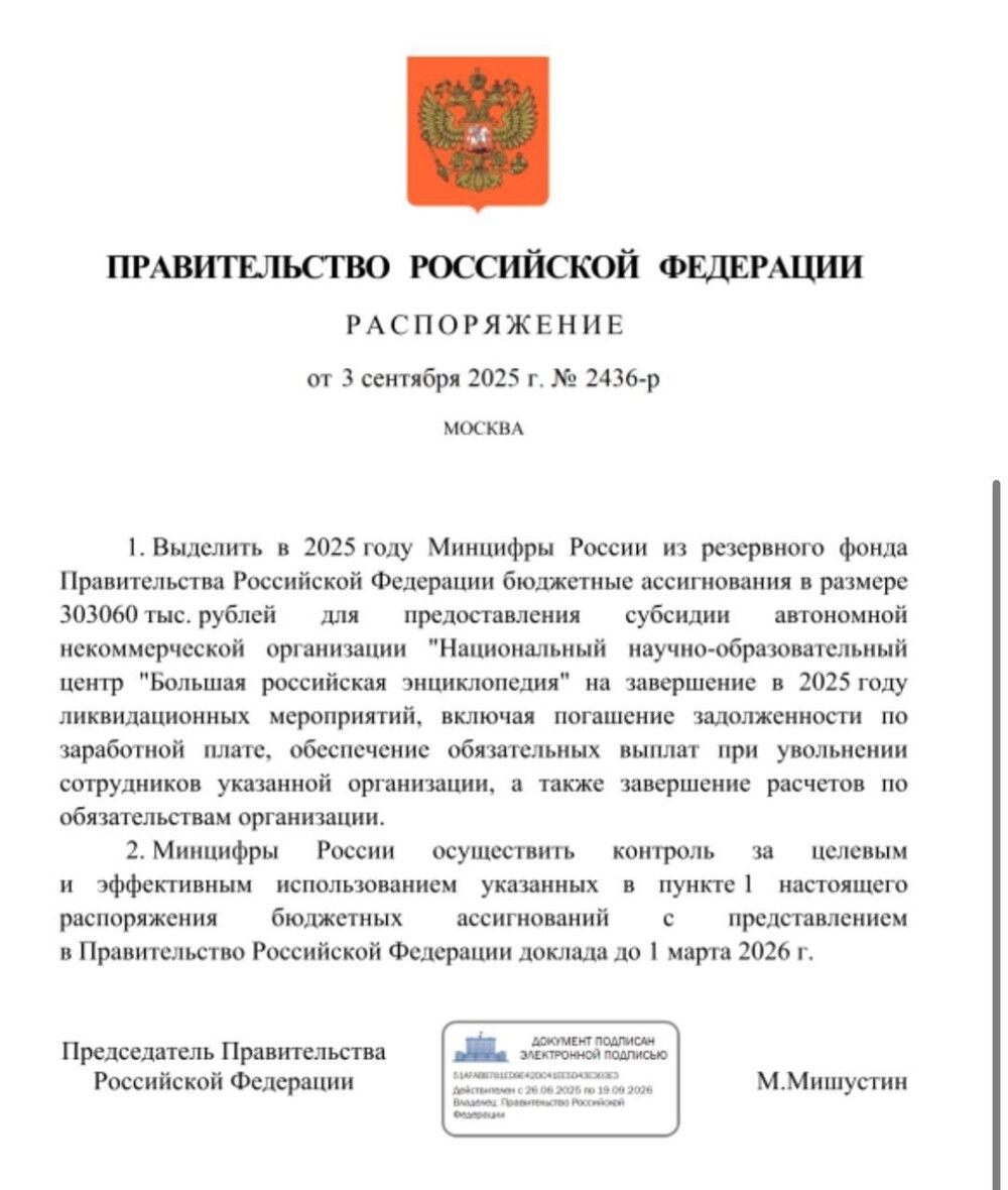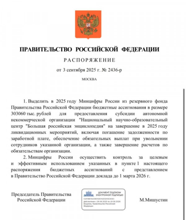 Российское правительство выделило 303 миллиона рублей на ликвидацию автономной некоммерческой организации "Национальный научно-образовательный центр „Большая российская энциклопедия"", созданной для разработки портала "Знание" - отечественного аналога Википедии. Распоряжение, подписанное премьер-министром Михаилом Мишустиным, опубликовано на портале правовой информации 4 сентября 2025 года. Средства из резервного фонда направят на погашение долгов по зарплатам, выплату компенсаций сотрудникам при увольнении и урегулирование прочих обязательств организации. Министерство цифрового развития, связи и массовых коммуникаций обязано обеспечить контроль за целевым использованием средств и представить отчет в правительство до 1 марта 2026 года.