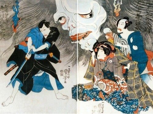 Ужас, наводимый госпожой Оивой, описан в пьесе кабуки "Ёцуя Кайдан", написанной Цуруей Намбоку в 1825 году. В пьесе госпожа Оива из клана Тамия замужем за ронином - самураем без хозяина по имени Иэмон, который, по совпадению, является объектом любви другой женщины по имени Оумэ. В рамках интриги, направленной на разрушение их отношений, Оумэ посылает Оиве отравленный крем для лица. Лицо Оивы обезображивается сразу после нанесения крема, и в шоке она случайно убивает себя, упав на свой собственный меч. Затем она превращается в мстительный дух, который преследует остальных персонажей, принося им несчастье.