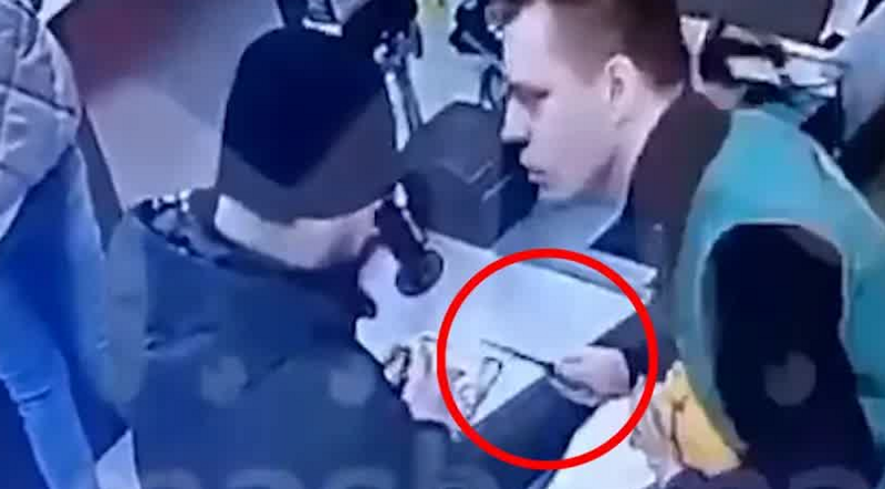 На опубликованных кадрах видно, как сотрудник ретейла ведёт спор с покупателем, откладывая пробитые товары. В какой-то момент мужчина достаёт из кармана нож и подносит его к оппоненту, продолжая перепалку. После кратковременных запугиваний администратор решил убрать холодное оружие, но случайно выронил его из рук.