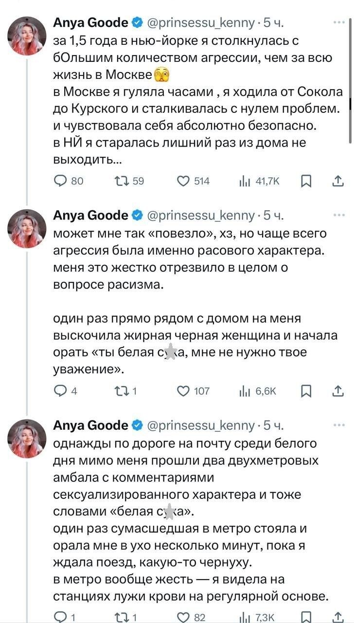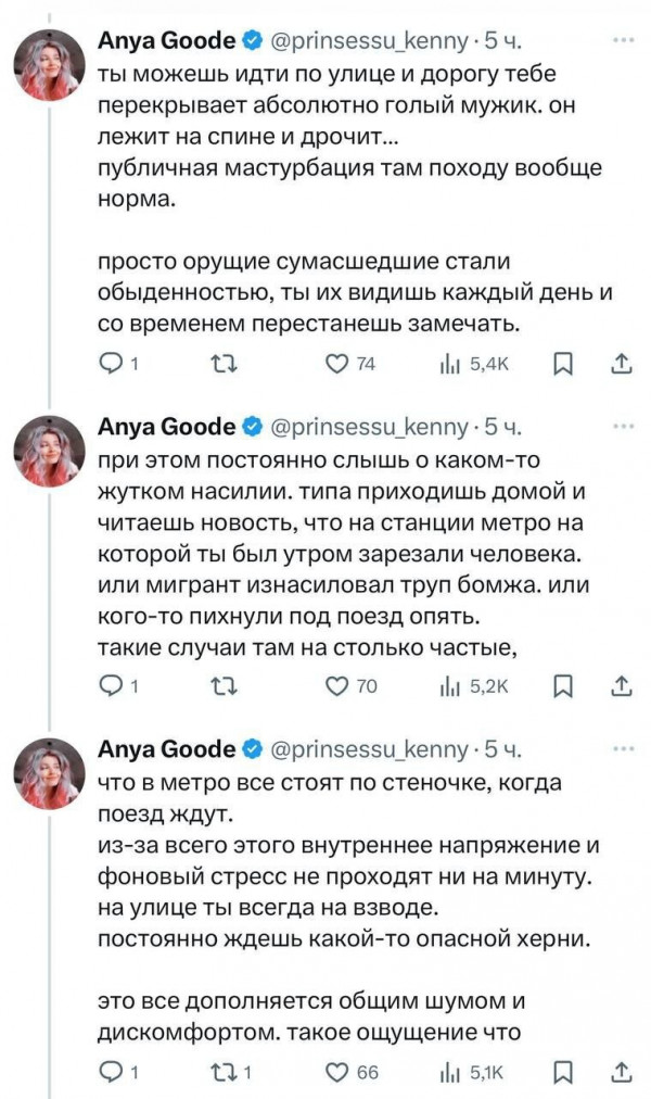 В постах она жалуется: вместо романтики - грязные вагоны, вместо дружелюбия - взгляды, от которых мурашки. Говорит, что это не город мечты, а школа цинизма.