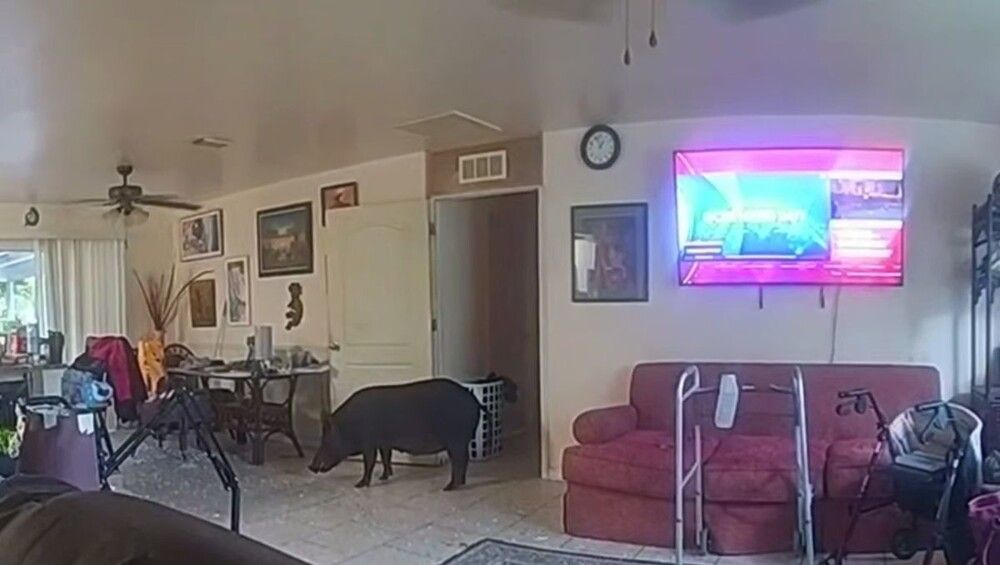 Достойное жилье дикий пятачок (чей вес превышал 135 кг) нашел в округе Ли (штат Флорида, США). Днем 4 сентября вломился через заднюю дверь и грозным видом намекнул владельцам, что теперь они бывшие. Те быстро побороли удивление и вызвали полицейских. Нарезку с нательных камер последних как раз и обнародовал местный шериф.Кабана отловили и отвезли подальше от выбранной им недвижимости, после чего отпустили на свободу.