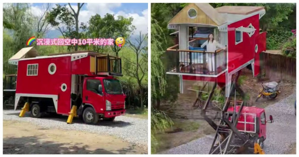 Жители Китая превратили старый грузовой автомобиль в современный автодом с подъемником.