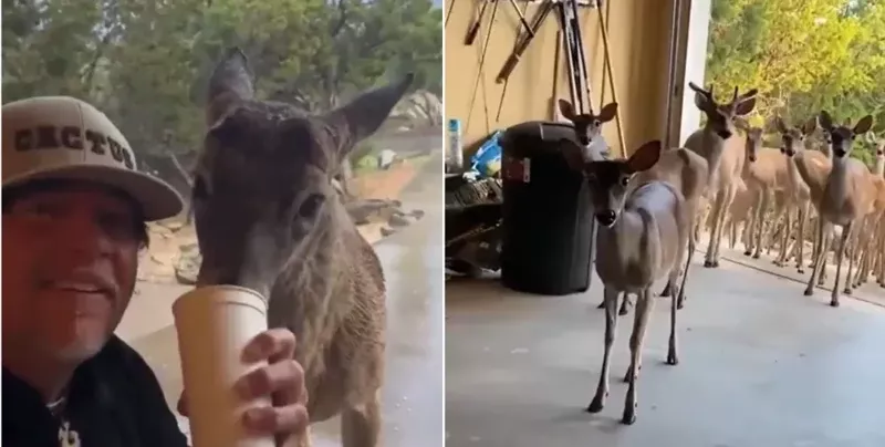 Житель США увидел, что к нему в гараж во время дождя пришел голодный олень. Мужчина накормил животное лакомством, а на следующий день увидел неожиданных гостей в своем дворе.