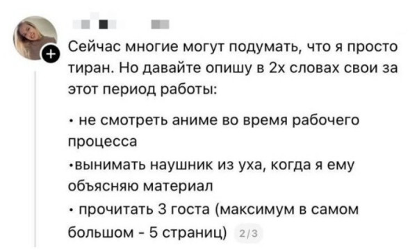 Парень пришёл с горящими глазами, а столкнулся с шоком: его заставляют учить какие-то ГОСТы - сухие стандарты, от которых мозг плавится. Ещё и аниме смотреть не дают, а наушники при начальнике вынимать требуют! Истерика началась: он нытьём заполнил чат, мол, это нечестно, он же не за этим сюда шёл. Девушка, к слову, была в шоке - не ожидала, что коллега превратится в драму-квин.