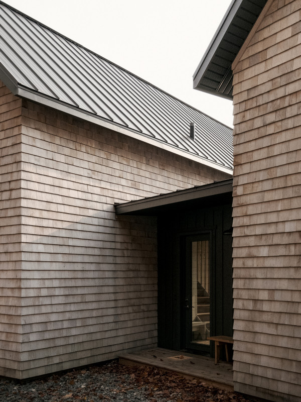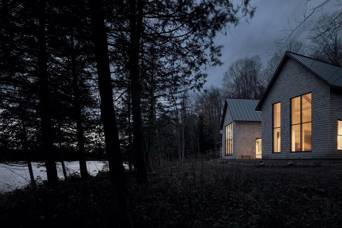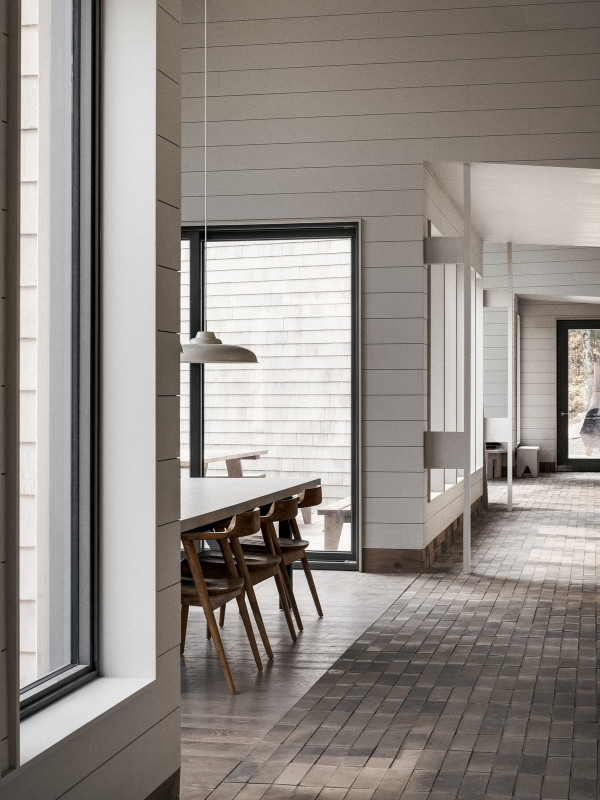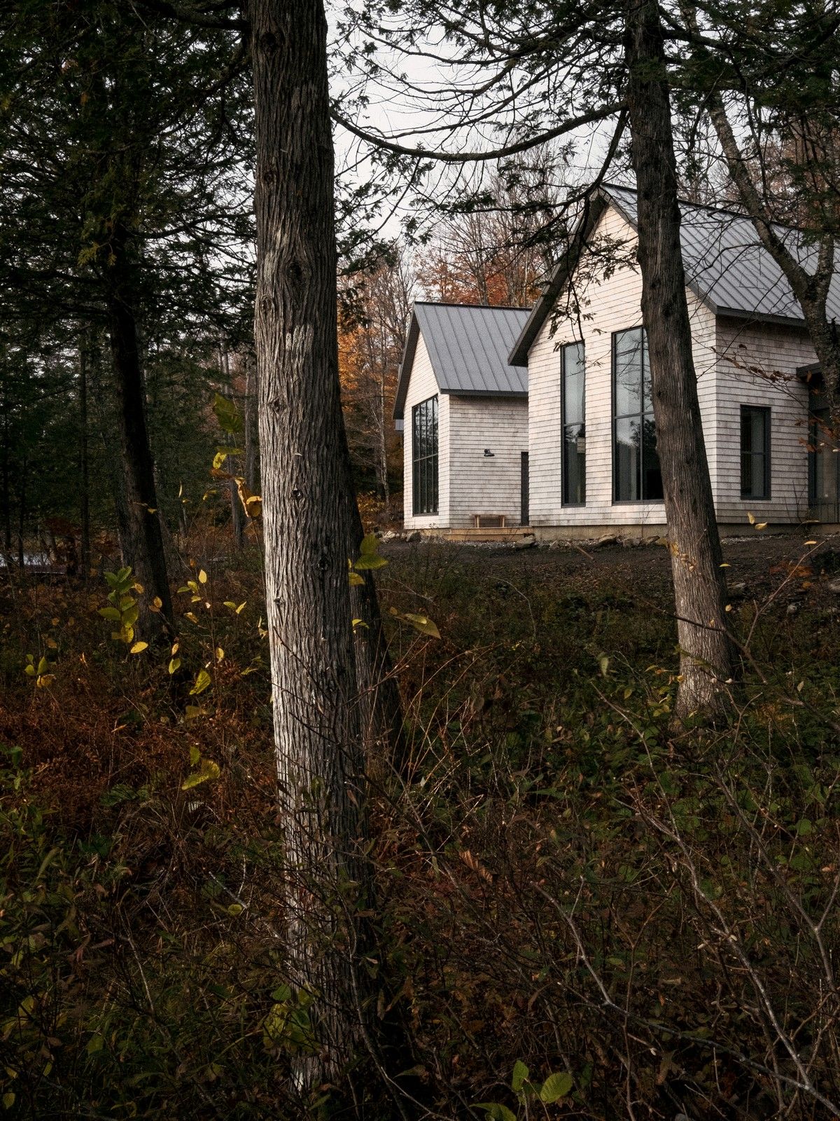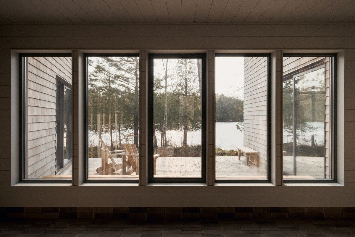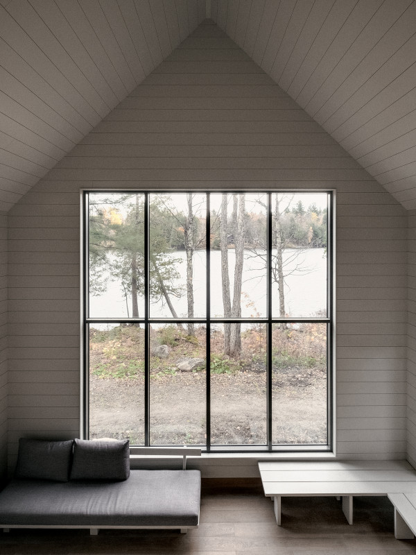 Заказчик хотел построить три отдельных, но взаимосвязанных дома. Самый западный дом предназначен для владельцев. Благодаря спальне, зоне отдыха, ванной и отдельной кухне, он может быть полностью закрыт для двух других домов. Самый большой дом на востоке был спроектирован для сдачи в аренду и может вместить до двух семей, с тремя комнатами и общежитием на втором этаже. В третьем доме, расположенном между двумя другими, есть общее пространство с кухней, обеденной зоной и гостиной. Длинный проход пересекает три резиденции и разделяет каждое здание на две части, создавая подпространства внутри и между домами. Южные области на этой линии - это общие жилые помещения, выходящие на озеро, а северные зарезервированы для комнат.В защищенном зале, соединяющем дома, кладовые помещения размещены на северной стороне, закрывая вид с дороги, а южная сторона открыта для озера и пропускает много света. Стеклянный коридор, пересекающий дома, подчёркивает путь своими импостами и меняющимся светом, создавая приглашение к странствиям и пространство, способствующее созерцанию и общению с природой. Кирпичный холл контрастирует с деревянными полами, выступая как отличительный элемент, так и объединяющий три дома. Городская материальность кирпича играет с понятиями интерьера и экстерьера, равно как мебель и проёмы, которые способствуют соединению с озером и стирают границы между внутренней и внешней стороной, создавая у людей внутри дома впечатление, что они обеими ногами находятся в вода.Трио веерообразных склонов коттеджа предлагает разные углы и виды на озеро и окружающую природу. Основание покрытия террасы обеспечивает прямую связь с землей. Две небольшие террасы, выходящие на юг и расположенные между домами, защищены от ветра, создавая микроклимат, который способствует использованию пространства немного позже в прохладный сезон. С уважением относясь к территории и окружающей среде, компания APPAREIL Architecture стремилась поддерживать территорию, максимально сохраняя её естественное состояние, добавляя в мебель только местные элементы. Внешнее покрытие из кедра является местным и долговечным для вневременного стиля. Проёмы выполнены на языке традиционного дома, предлагая модернизированную версию с большими окнами. Короткие свесы крыши придают коттеджу более современный вид.