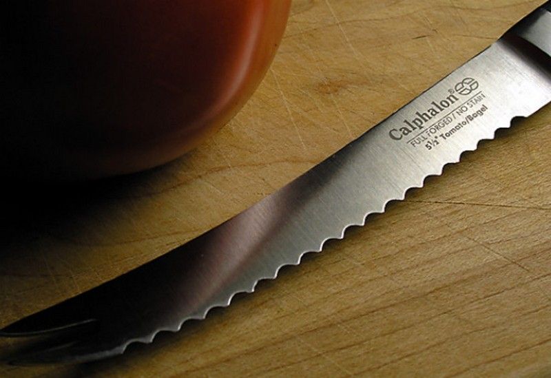 Традиционно ножи с зазубренным лезвием используются для нарезки мягкого хлеба. Однако у многих найдётся уменьшенный вариант этого клинка с раздвоенным кончиком. Вот у этого ножа уже другой функционал - им измельчают помидоры. Впрочем, он неплохо справится и с другими овощами и фруктами, которые имели твёрдую кожуру, но были мягкие внутри. В отличие от прямых лезвий, которые просто мнут плоды, зазубренная модификация сохранит их форму. А наличие раздвоенного кончика поможет накалывать и перемешивать нарезанные дольки овощей.