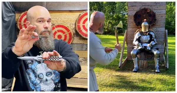 Мужчина научился мастерски метать ножи и топоры. Он всегда попадает точно в цель.
