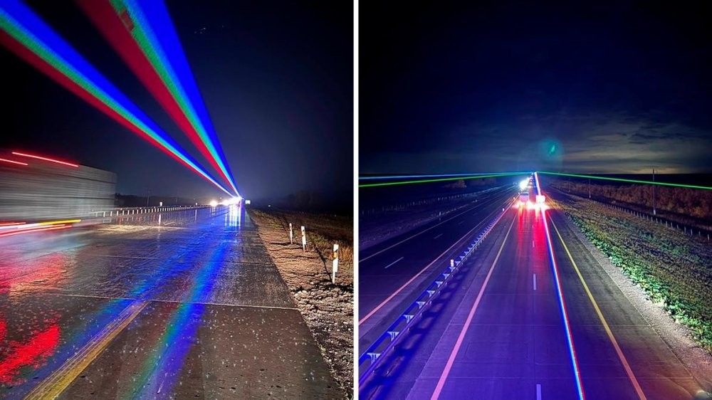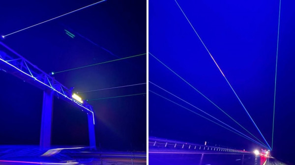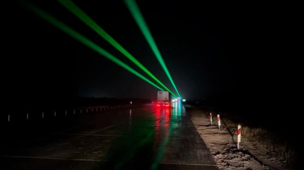 Лазерные пушки установили дорожники на арках неподалёку от села Ошаганды. В темноте они стреляют лучами вдаль, чтобы информировать водителей.