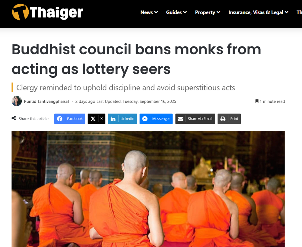 16 сентября 2025 года Высший совет Сангхи Таиланда подтвердил запрет монахам предсказывать выигрыши в лотереях. Решение, уходящее корнями в постановление 1955 года, продиктовано ростом случаев, когда даже высокопоставленные священнослужители выдают себя за оракулов. В Таиланде, где 95% населения исповедуют буддизм тхеравады, лотерея - национальная страсть с призами до 30 миллионов бат (примерно 77 миллионов рублей). Люди ищут у монахов "счастливые числа", но неудачи порождают разочарование не только в предсказаниях, но и в вере. "Это противоречит Дхарме", - заявил представитель Сангхи, предупреждая о выговорах и лишении сана за нарушения.