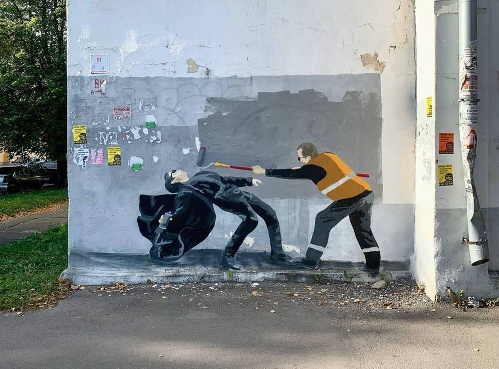 Уличный художник Мишкин нарисовал в столице Владимирской области главного героя фильма "Матрица", который противостоит коммунальщику, замазывающему граффити.