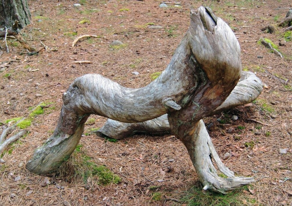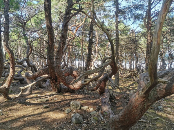 Это место, где природа словно сошла с ума от собственной фантазии. Двухсотлетние сосны, изогнутые порывами ветра, застыли в причудливом танце. Их стволы, одетые в седые лишайники, больше похожи на спины древних мифических существ, а ползучий плющ довершает картину, создавая ощущение, будто лес вот-вот оживёт.