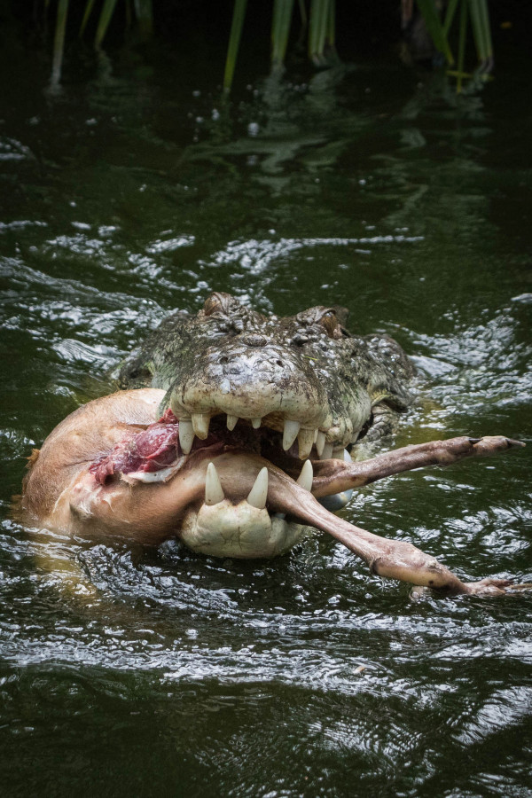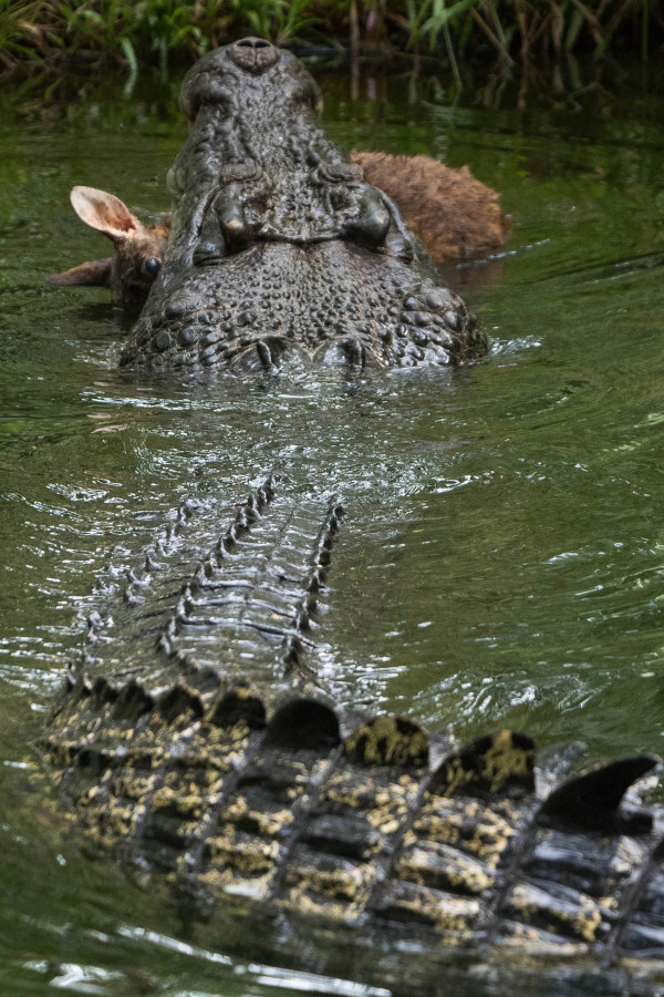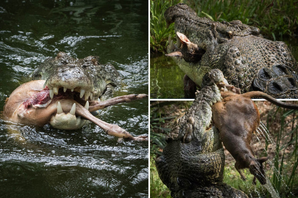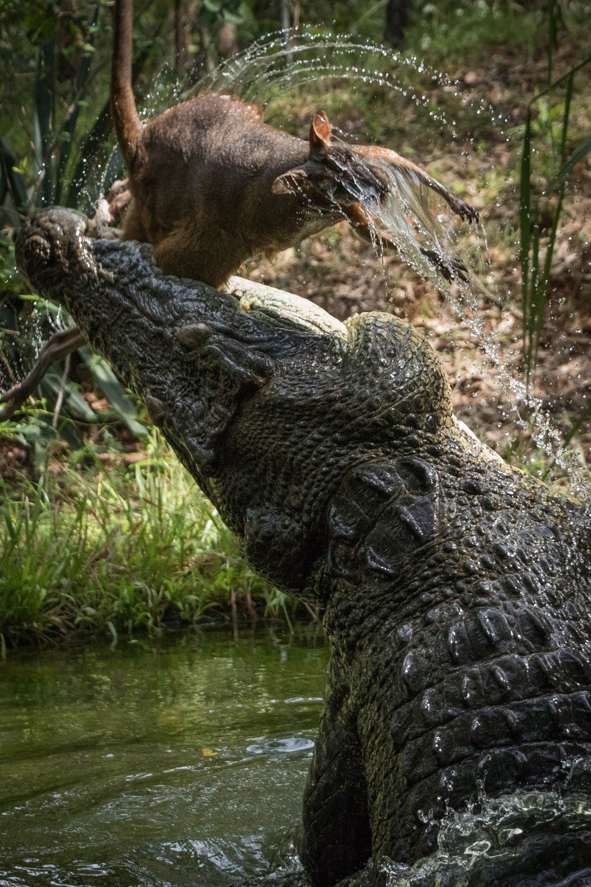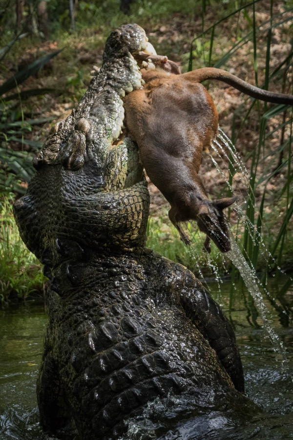 Эти фотографии были сделаны специалистом по крокодилам 50-летним доктором Адамом Бриттоном из Дарвина, Австралия, который запечатлел жестокое нападение в специализированном учреждении своего родного города всего в 5 метрах от него. 5-метровому крокодилу по кличке Смауг бросили в вольер мертвого валлаби, которого сбили на дороге. Крокодил за считанные секунды схватил свою добычу и потащил под воды, чтобы утопить, хоть животное уже было мертвым. Затем крокодил яростно швырял тушу из стороны в сторону и разорвал на несколько частей. Меньше чем через минуту валлаби был съеден.