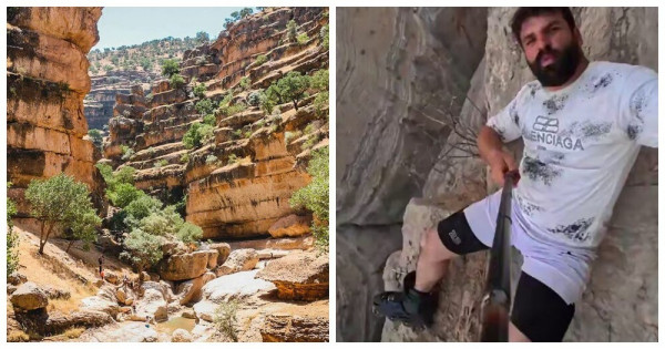 Мужчина стоит на роликах на скалистом склоне гор Загрос, держась с трудом и балансируя на большой высоте. Видео показывает напряжённый момент и сложность передвижения в экстремальных условиях.