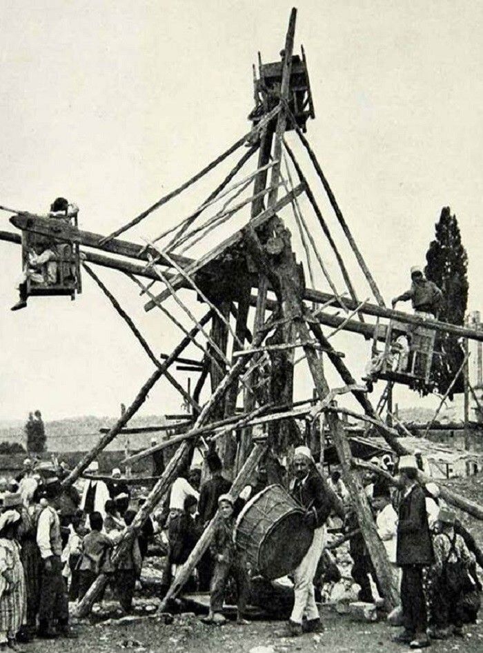 Расположено, вероятно, в сельской местности Турции или на Балканах, начало 1900-х годов. Эти ручные аттракционы были довольно распространены на деревенских ярмарках и рынках по всей Османской империи и соседних регионах.