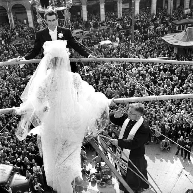 Берти Оманковски и Роджер Декугис были звёздами-канатоходцами из легендарной труппы Les Diables Blancs, возглавляемой отцом Берти, Рудольфом "Папой Руди" Оманковски.22 мая 1954 года они поженились на канате, натянутом над площадью Капитолия в Тулузе. На высоте нескольких метров, над толпой зрителей, отец Роберт Симон, известный как летающий священник, благословил их с пожарной лестницы. Тулузский фотограф Жан Дьезайд запечатлел этот момент, сидя на плечах Папы Руди, который балансировал на канате.
