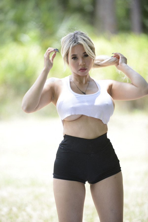 Американская модель Белла Банни Амор (Bella Bunnie Amor) в крохотном топе и коротеньких шортиках делает зарядку в парке в Майами.