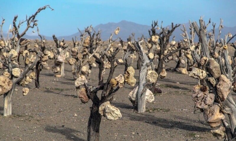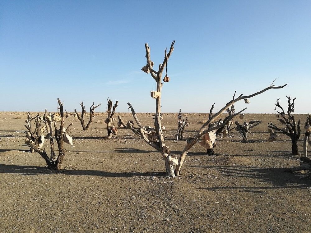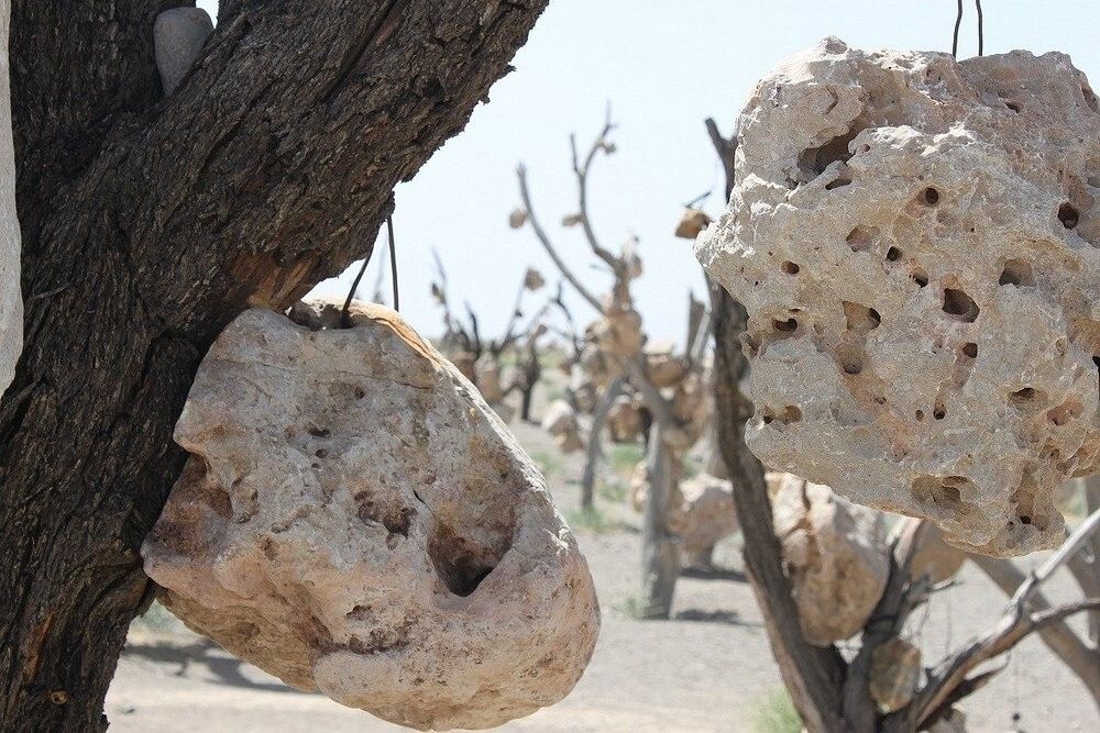 Посреди бескрайней пустыни находится этот невероятный сад каменных деревьев. Сотни высоких засохших деревьев простираются далеко по пескам, и с ветвей каждого свисают камни, большие и малые, некоторые весом более девяти килограммов. Это рукотворный рай для искателей странного, и зрелище это поистине завораживающее.