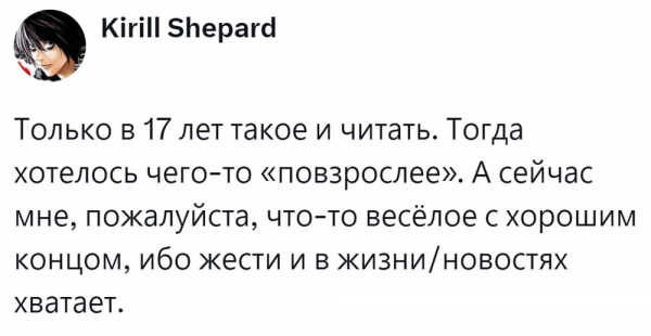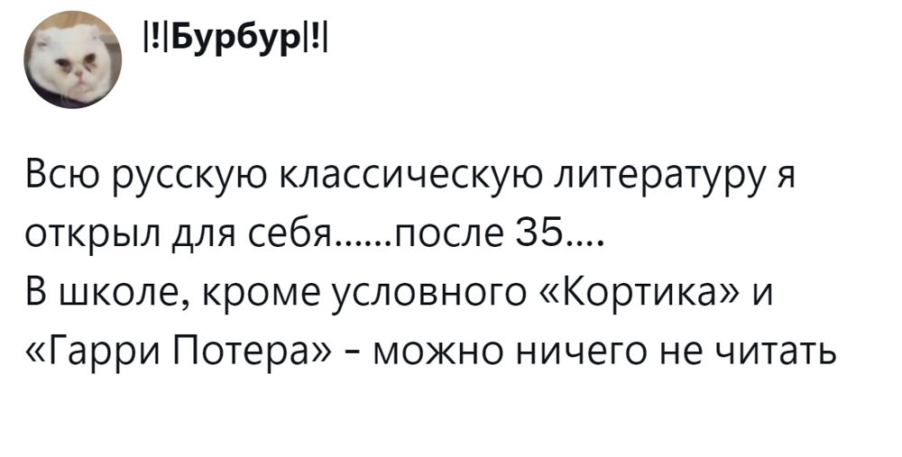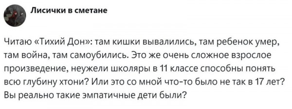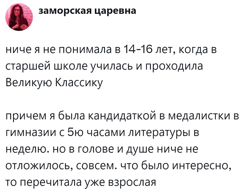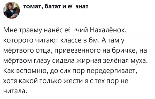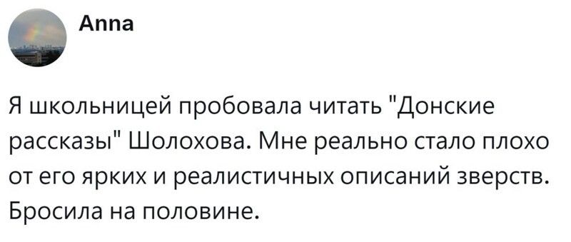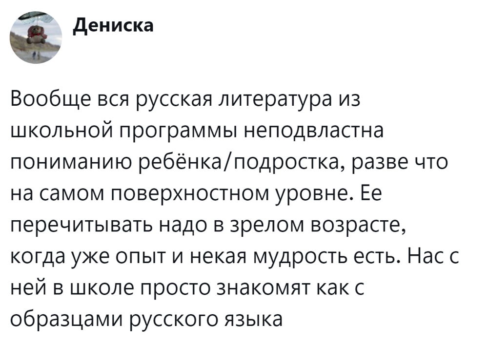 И речь не только о "Муму" Тургенева. Что у наших, что у зарубежных классиков в произведениях масса описаний насилия, как физического, так и психологического, смертей, боли, лишений, моральных терзаний, через которые приходится пройти героям. Некоторые школьники осознали это в бытность обучения, а к другим понимание пришло уже во взрослом возрасте. Пользователи поделились наболевшим по этому вопросу и сошлись во мнении, что школьная программа по литературе нуждается в корректировке.