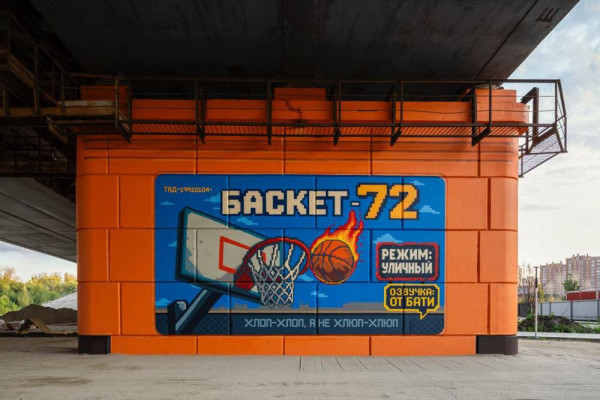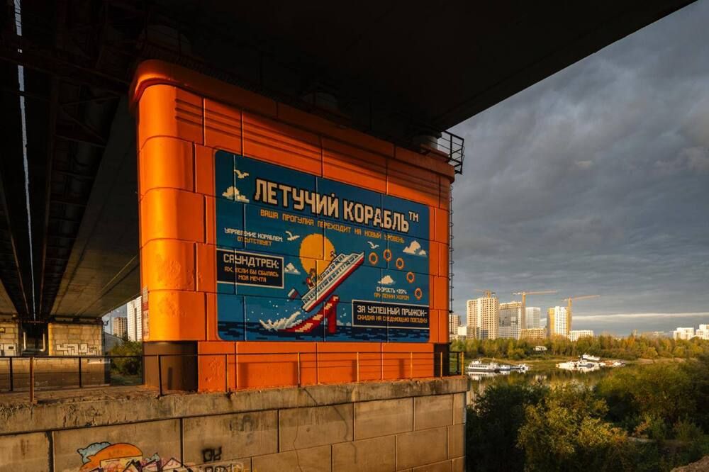 Художник Андрей Топоров совместно со строительной компанией превратил опоры моста в картриджи "Денди". Один из арт-объектов - история Речпорта с краном Ганцом.