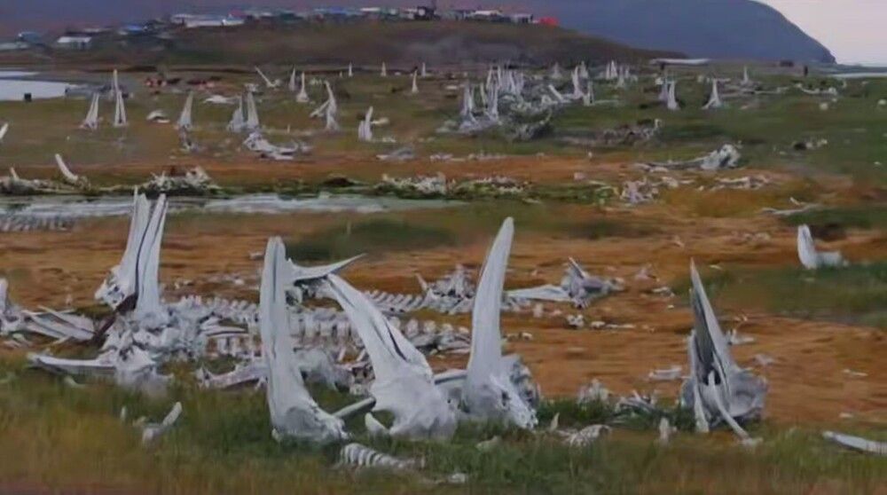 На Чукотке до сих пор разрешена добыча китов. Загарпуненного кита вытаскивают на берег, какую-то часть туши ритуально "отдают" морю, а кости складируют на окраинах посёлков.