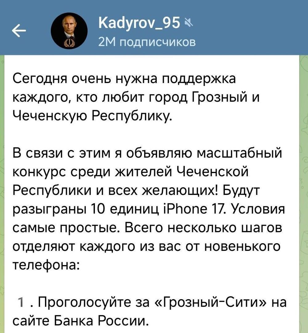 Глава Чечни Рамзан Кадыров объявил о розыгрыше десяти iPhone 17 среди участников голосования за символы на новой 500-рублёвой банкноте на сайте Банка России. В своём Telegram-канале он написал, что надеется на поддержку каждого, кто любит Чечню и готов проголосовать за "Грозный Сити".Интересно, что конкурсанты, желающие заполучить новый айфон от Кадырова, должны использовать лазейку и проголосовать за "Грозный Сити" целых четыре раза (через "ВКонтакте", "Одноклассники", электронную почту и "Госуслуги"), а затем опубликовать в своих соцсетях подтверждающие скриншоты с тегом "ГолосуюзаЧечню"."Победитель будет определён рандомным способом среди тех участников, кто выполнит все условия. Стоп конкурса 11 октября в 12 часов 00 минут! Участвуйте в розыгрыше! Не упустите свой шанс!", - говорится в канале главы Чечни.
