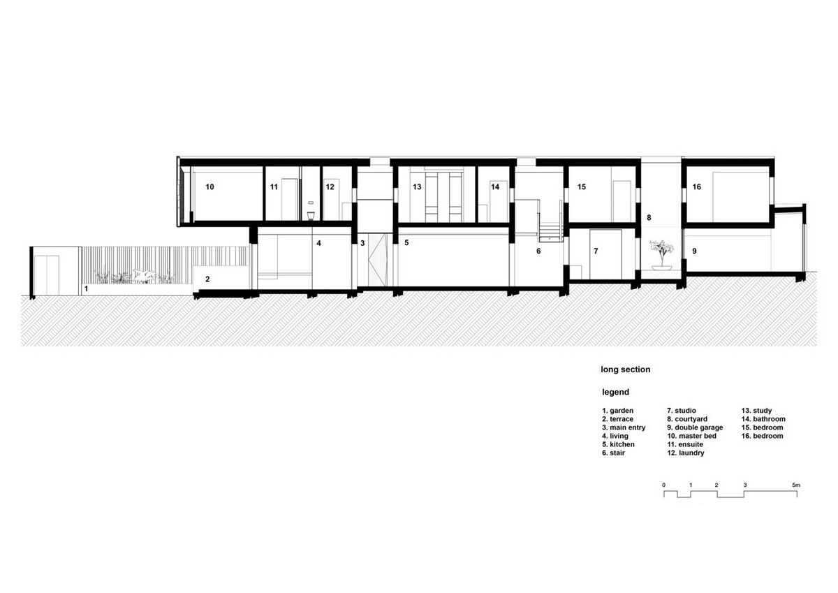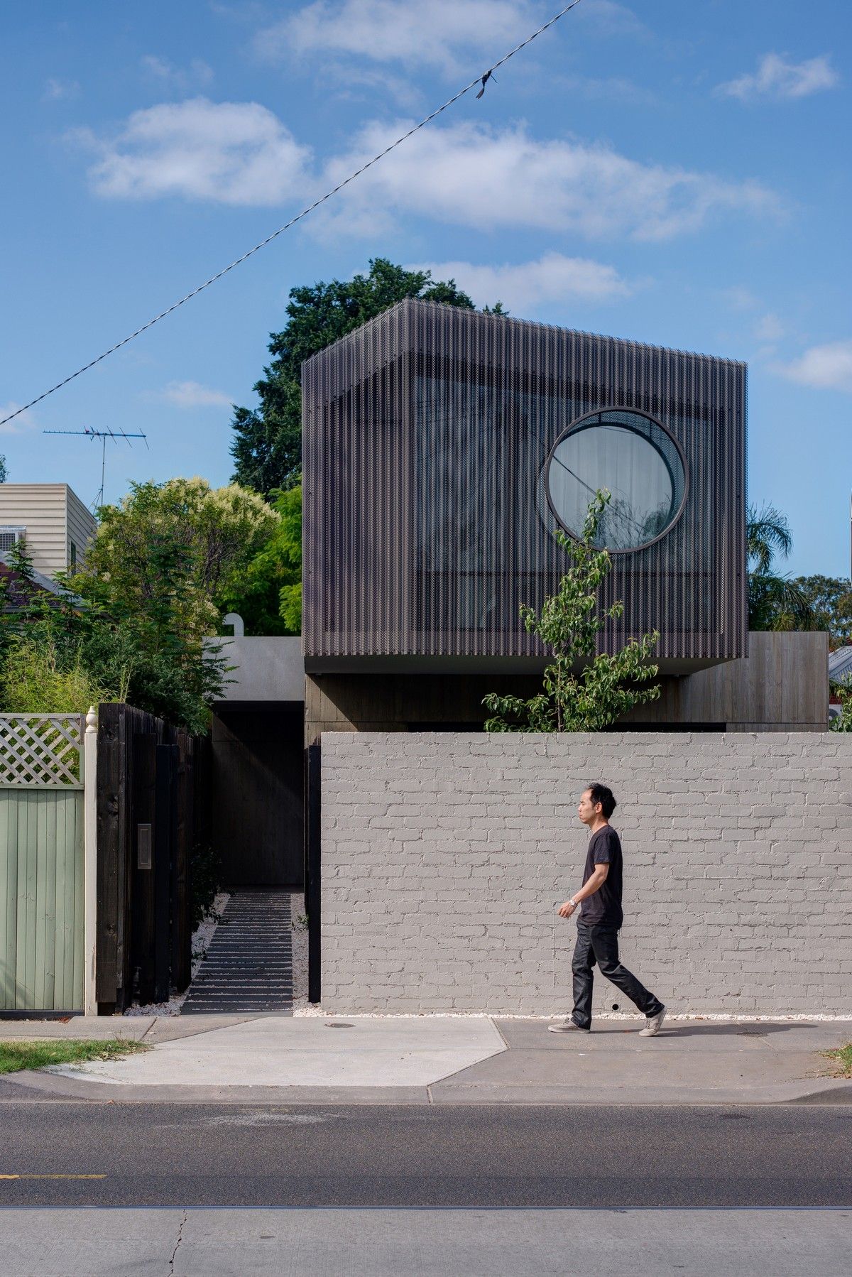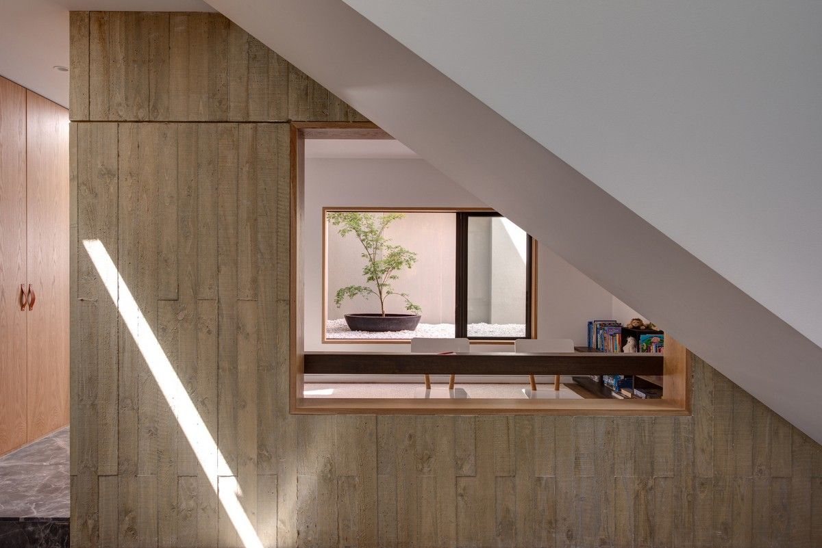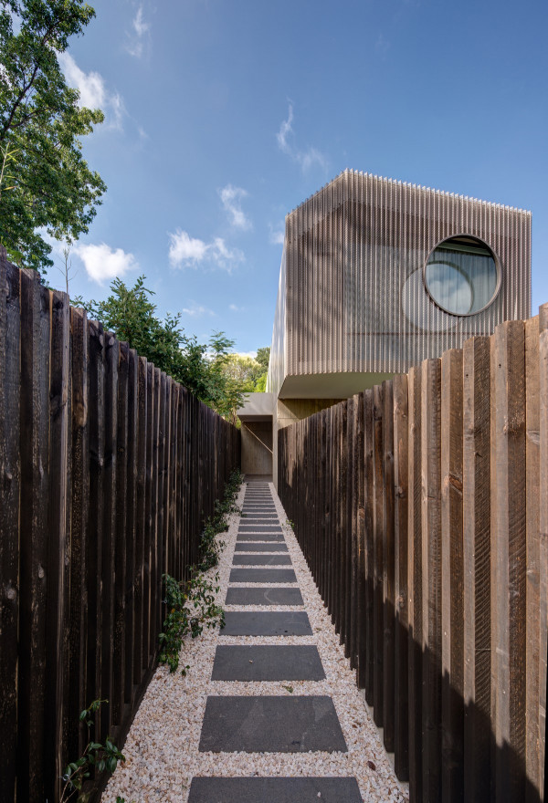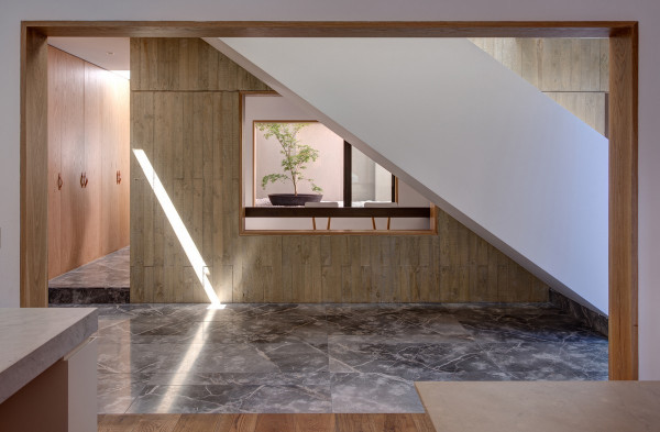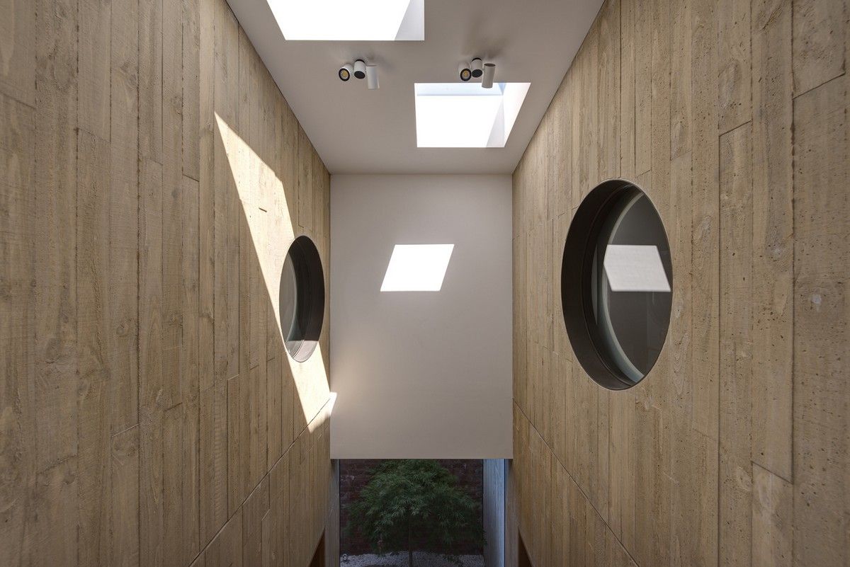 Двухэтажный семейный дом площадью 302 квадратных метров имеет глубокий и узкий план с эффектным контрастом между формой и пространственным восприятием. Программу дома формирует комбинация павильонов, расположенных по всему участку подобно ступенькам. Связь между павильонами и промежуточными пространствами между ними создает ощущение большого свободного пространства и предоставляет большую возможность для взаимодействия членов семьи.Пространства, занимающие нижний этаж дома, в том числе входная зона, сад, библиотека, световые колодцы и лестница, напоминают переулки, которые увеличивают уровни интерактивных порогов в основные жилые зоны - гостиную, столовую и кухню. Вытянутые вверх на второй этаж павильоны охватывают длинный линейный объем приватной зоны с четырьмя спальнями.Верхний этаж оформлен в виде элегантной консольной балки с плотной перегородкой из фиброцементных панелей с безрамным остеклением и интегрированными вентиляционными панелями, которые объединяют комнаты в элегантный объем. В консольной части этажа размещается главная спальня с круглым проемом-окном, призванным создать более мягкую интимную атмосферу. Выступающий консоль обеспечивает защищенное место для садовой террасы внизу.Тонированные наклонные плиты из сборного железобетона и павильоны, облицованные деревянным шпоном, усиливают связь между экстерьером и интерьером, а оригинальные материалы внедряются глубоко в дом. Полы из промасленного дуба в павильонах контрастируют с мраморными каменными полами в межстенных колодцах. Световые колодцы и дворы двойной высоты отслеживают траекторию движения солнца в течение дня и передают игру света и тени в пространство, делая его особенно живым и динамичным. Присутствующие в интерьере натуральные материалы, среди которых дерево и мрамор, способствуют созданию атмосферы 70-х годов.