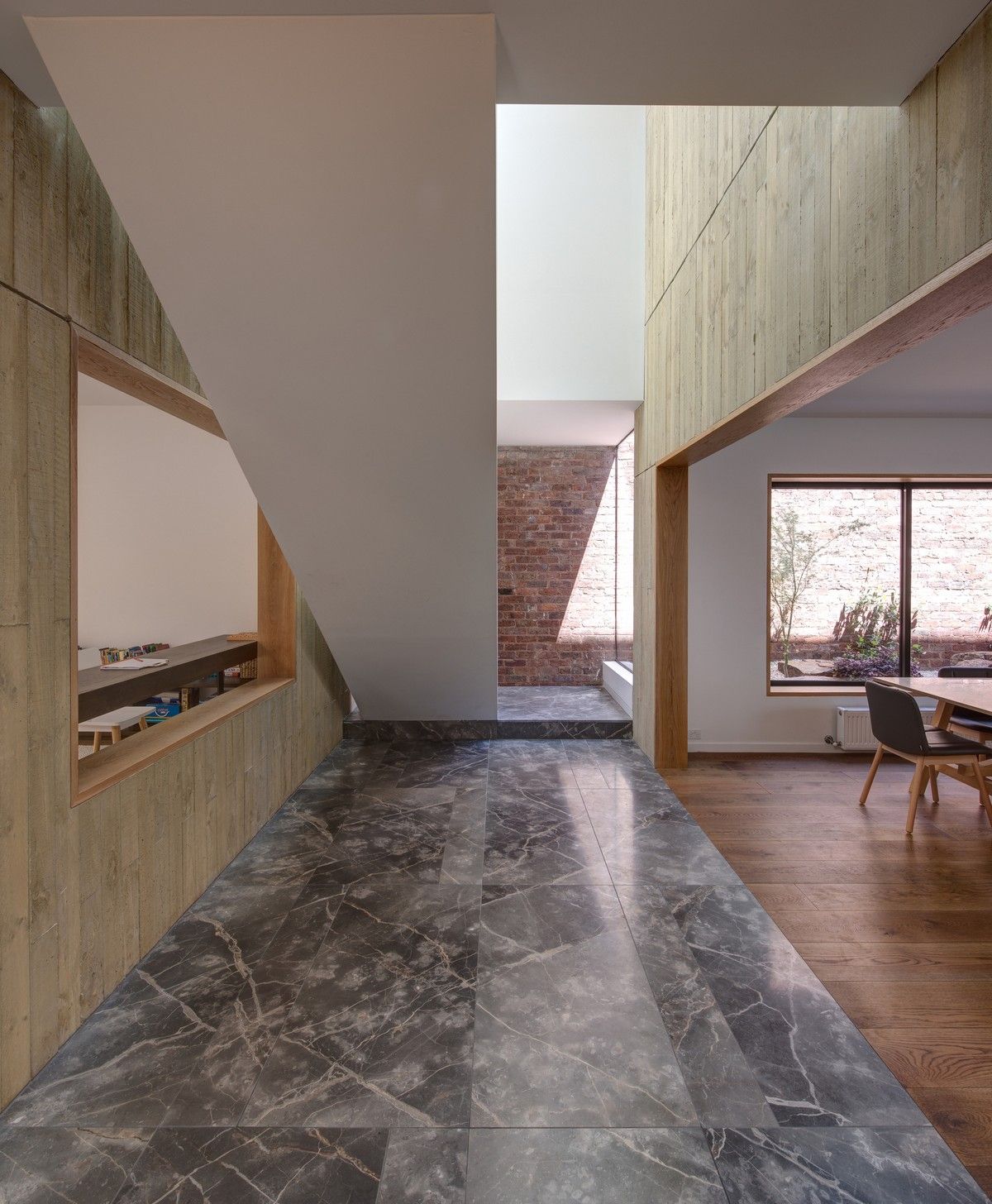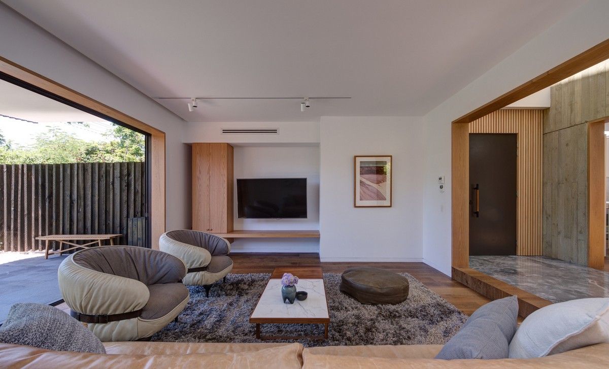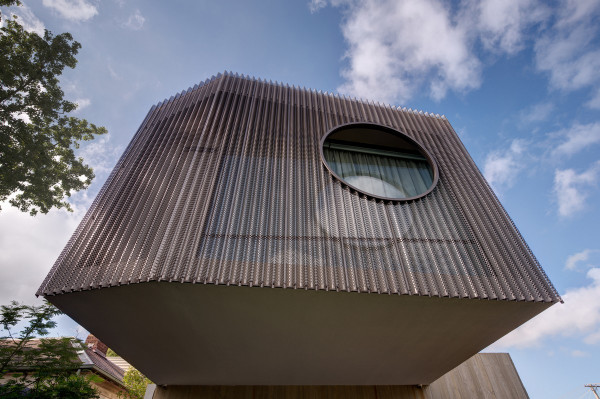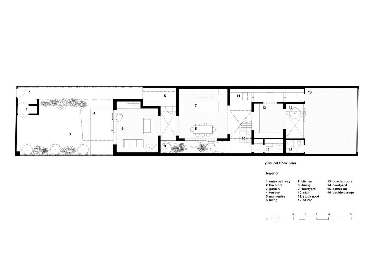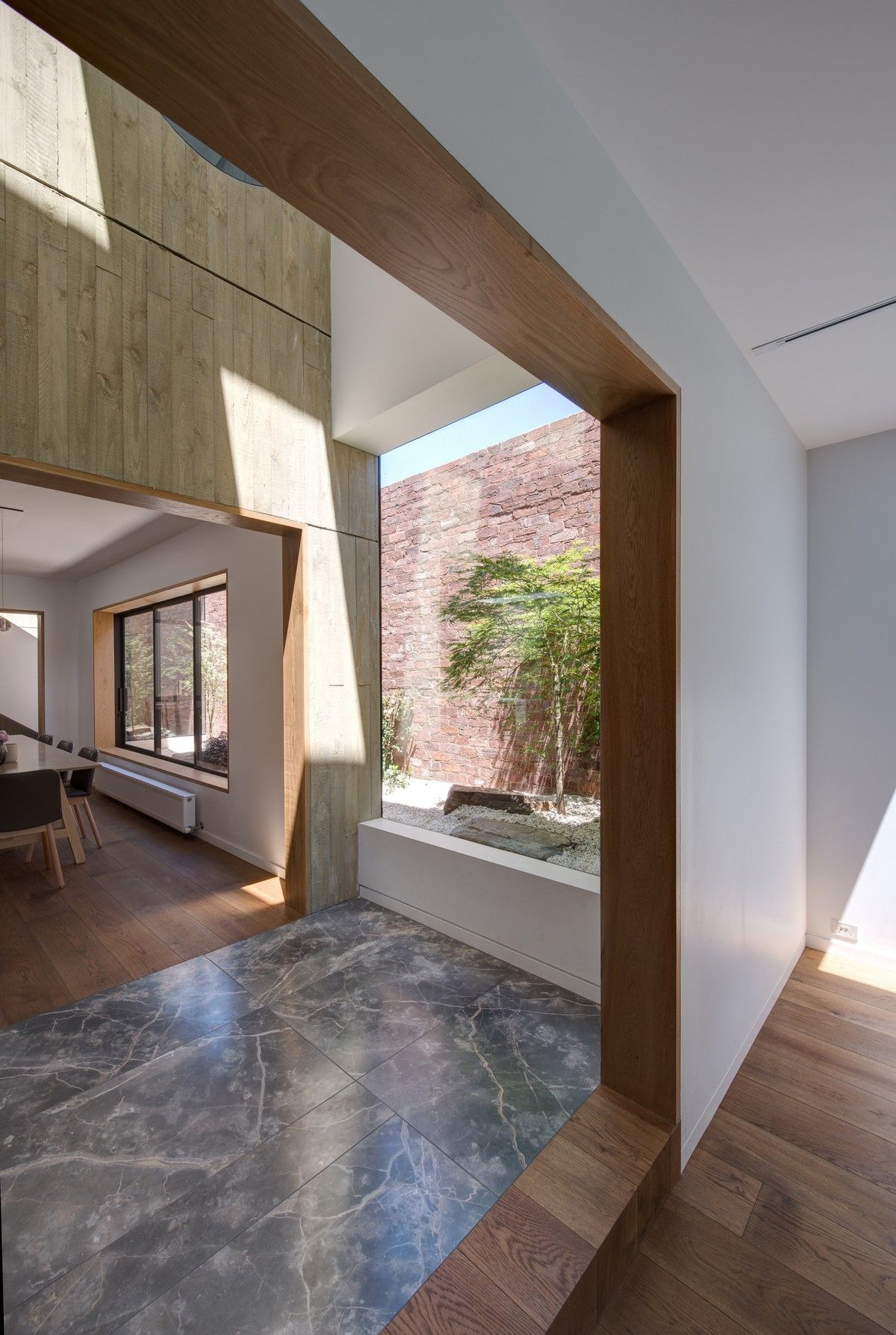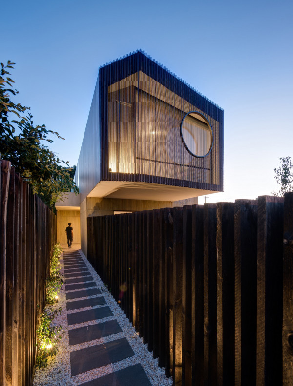Двухэтажный семейный дом площадью 302 квадратных метров имеет глубокий и узкий план с эффектным контрастом между формой и пространственным восприятием. Программу дома формирует комбинация павильонов, расположенных по всему участку подобно ступенькам. Связь между павильонами и промежуточными пространствами между ними создает ощущение большого свободного пространства и предоставляет большую возможность для взаимодействия членов семьи.Пространства, занимающие нижний этаж дома, в том числе входная зона, сад, библиотека, световые колодцы и лестница, напоминают переулки, которые увеличивают уровни интерактивных порогов в основные жилые зоны - гостиную, столовую и кухню. Вытянутые вверх на второй этаж павильоны охватывают длинный линейный объем приватной зоны с четырьмя спальнями.Верхний этаж оформлен в виде элегантной консольной балки с плотной перегородкой из фиброцементных панелей с безрамным остеклением и интегрированными вентиляционными панелями, которые объединяют комнаты в элегантный объем. В консольной части этажа размещается главная спальня с круглым проемом-окном, призванным создать более мягкую интимную атмосферу. Выступающий консоль обеспечивает защищенное место для садовой террасы внизу.Тонированные наклонные плиты из сборного железобетона и павильоны, облицованные деревянным шпоном, усиливают связь между экстерьером и интерьером, а оригинальные материалы внедряются глубоко в дом. Полы из промасленного дуба в павильонах контрастируют с мраморными каменными полами в межстенных колодцах. Световые колодцы и дворы двойной высоты отслеживают траекторию движения солнца в течение дня и передают игру света и тени в пространство, делая его особенно живым и динамичным. Присутствующие в интерьере натуральные материалы, среди которых дерево и мрамор, способствуют созданию атмосферы 70-х годов.