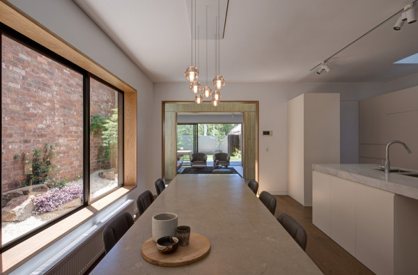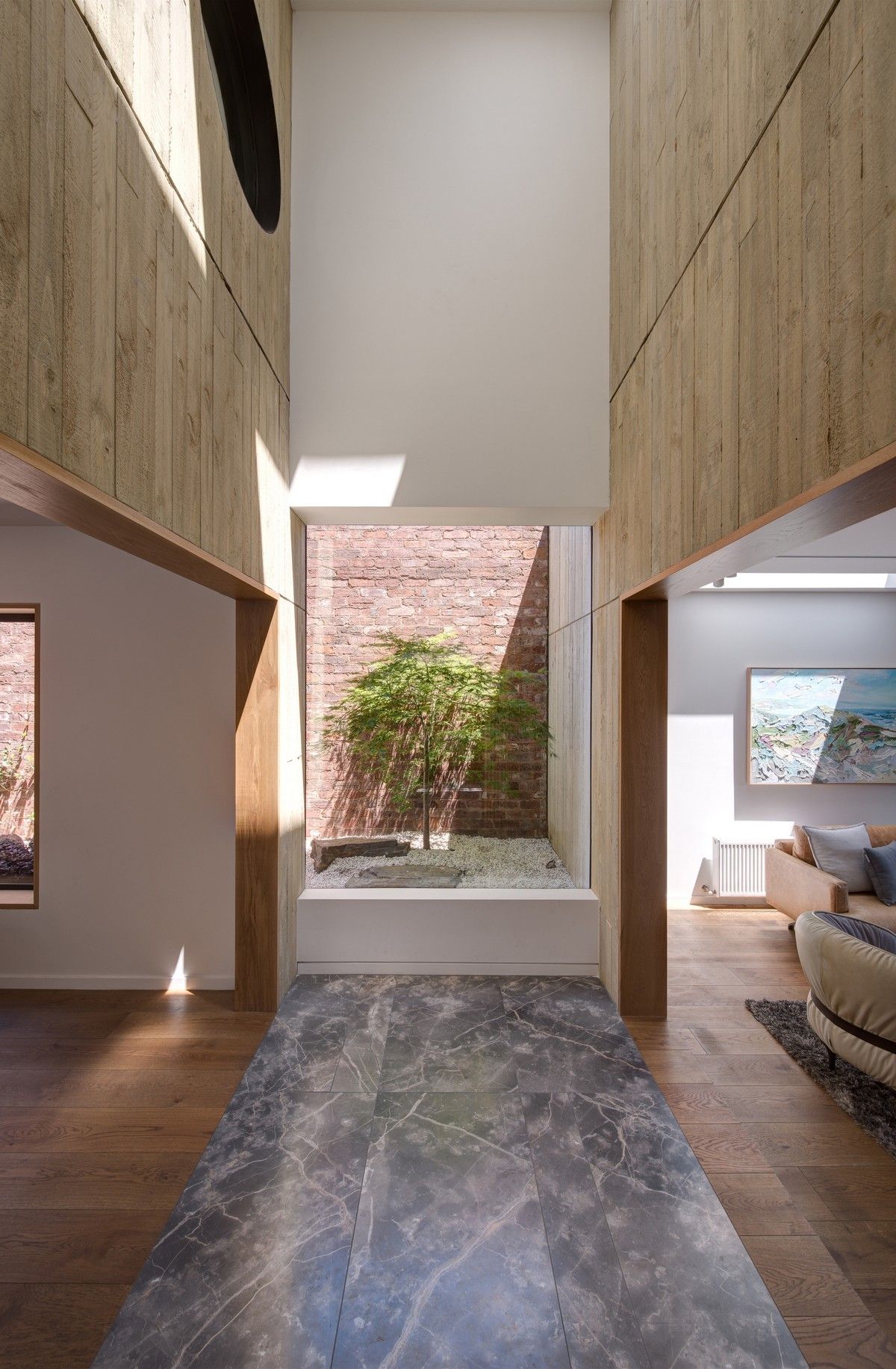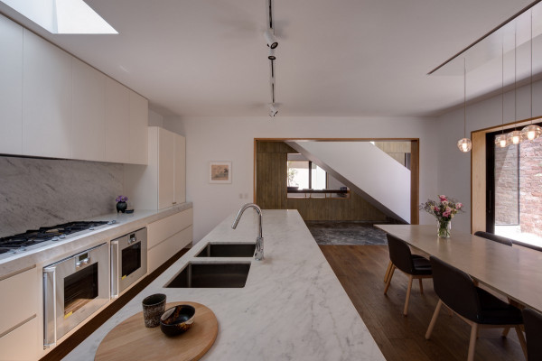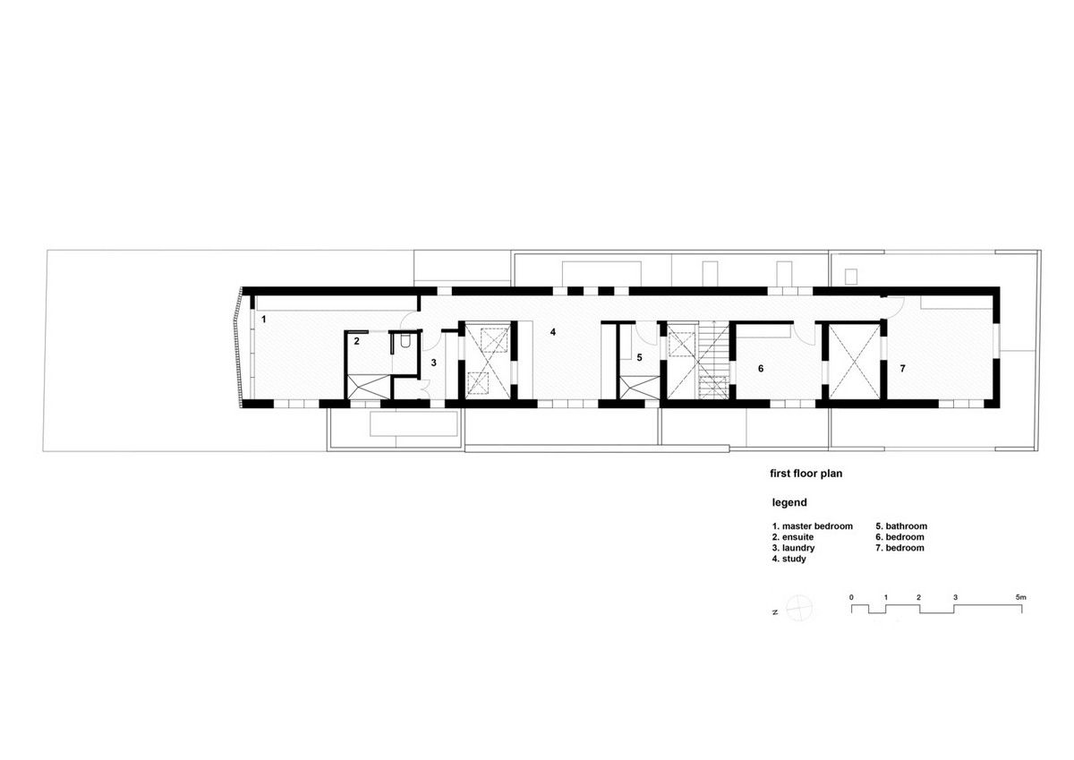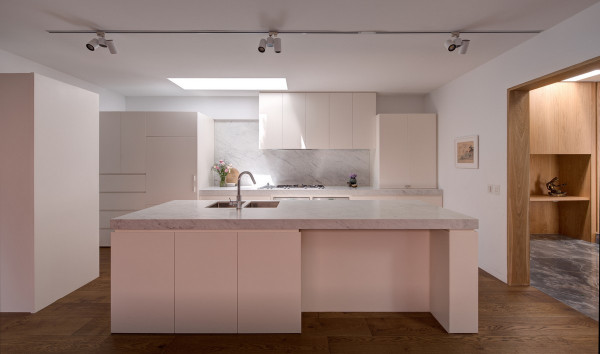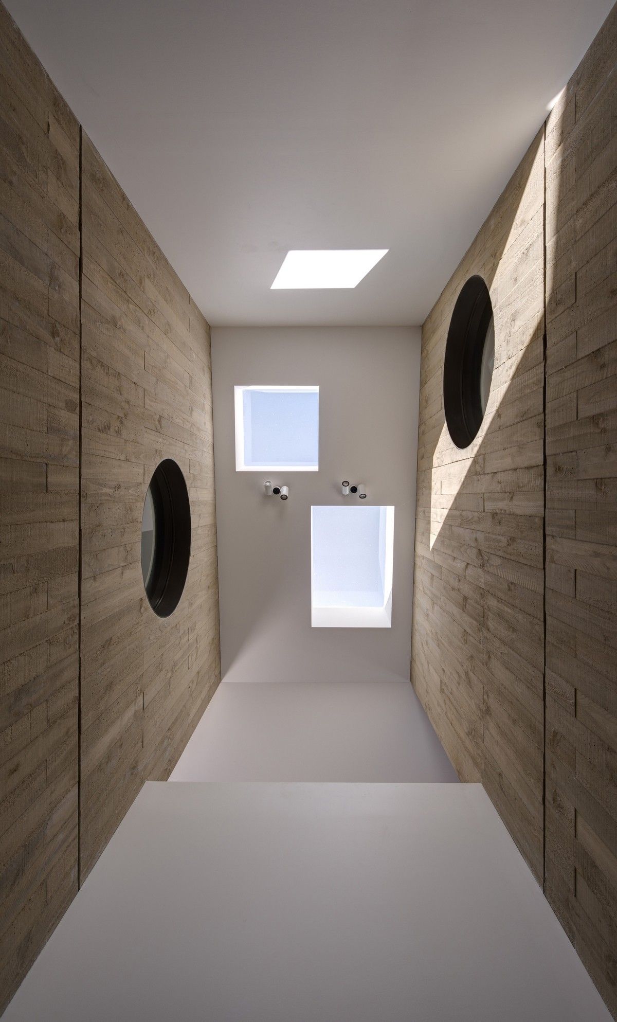 Двухэтажный семейный дом площадью 302 квадратных метров имеет глубокий и узкий план с эффектным контрастом между формой и пространственным восприятием. Программу дома формирует комбинация павильонов, расположенных по всему участку подобно ступенькам. Связь между павильонами и промежуточными пространствами между ними создает ощущение большого свободного пространства и предоставляет большую возможность для взаимодействия членов семьи.Пространства, занимающие нижний этаж дома, в том числе входная зона, сад, библиотека, световые колодцы и лестница, напоминают переулки, которые увеличивают уровни интерактивных порогов в основные жилые зоны - гостиную, столовую и кухню. Вытянутые вверх на второй этаж павильоны охватывают длинный линейный объем приватной зоны с четырьмя спальнями.Верхний этаж оформлен в виде элегантной консольной балки с плотной перегородкой из фиброцементных панелей с безрамным остеклением и интегрированными вентиляционными панелями, которые объединяют комнаты в элегантный объем. В консольной части этажа размещается главная спальня с круглым проемом-окном, призванным создать более мягкую интимную атмосферу. Выступающий консоль обеспечивает защищенное место для садовой террасы внизу.Тонированные наклонные плиты из сборного железобетона и павильоны, облицованные деревянным шпоном, усиливают связь между экстерьером и интерьером, а оригинальные материалы внедряются глубоко в дом. Полы из промасленного дуба в павильонах контрастируют с мраморными каменными полами в межстенных колодцах. Световые колодцы и дворы двойной высоты отслеживают траекторию движения солнца в течение дня и передают игру света и тени в пространство, делая его особенно живым и динамичным. Присутствующие в интерьере натуральные материалы, среди которых дерево и мрамор, способствуют созданию атмосферы 70-х годов.