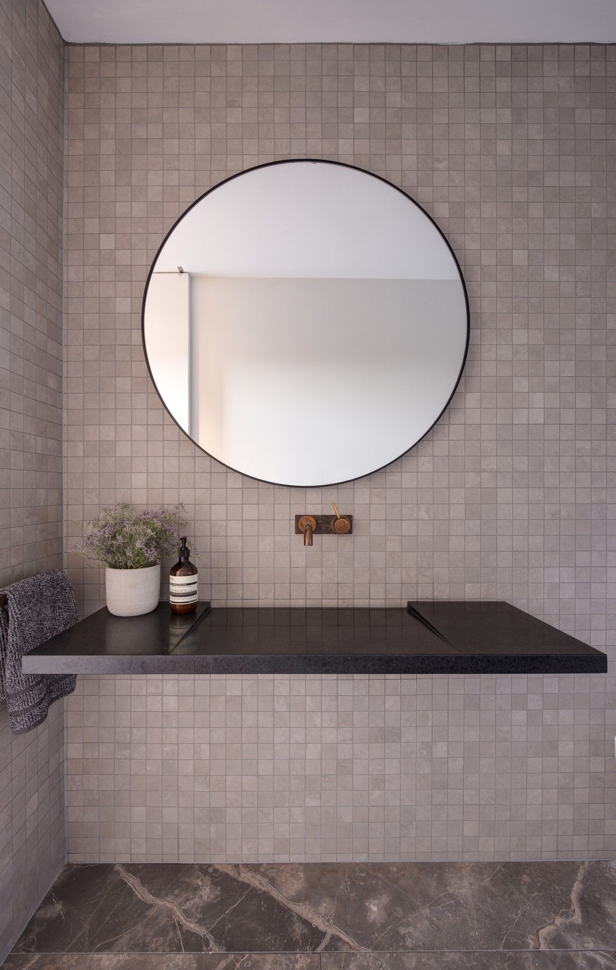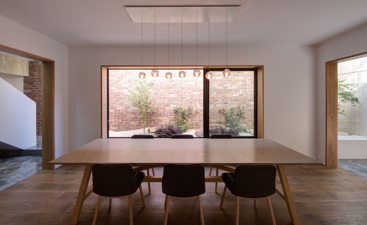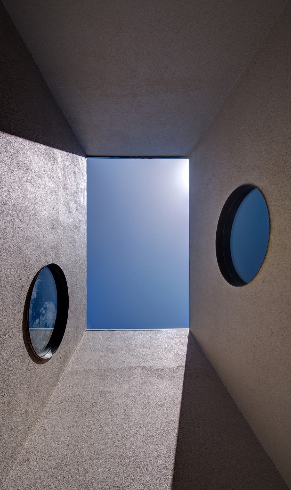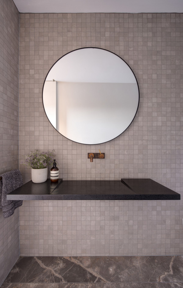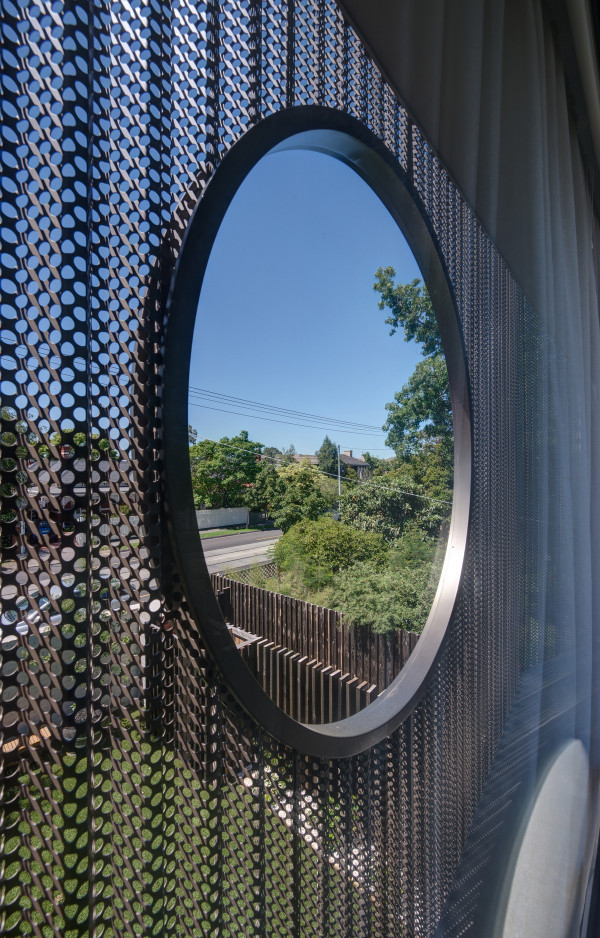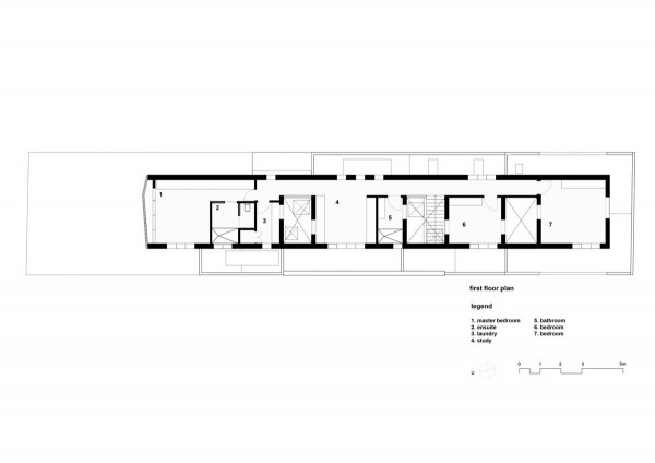Двухэтажный семейный дом площадью 302 квадратных метров имеет глубокий и узкий план с эффектным контрастом между формой и пространственным восприятием. Программу дома формирует комбинация павильонов, расположенных по всему участку подобно ступенькам. Связь между павильонами и промежуточными пространствами между ними создает ощущение большого свободного пространства и предоставляет большую возможность для взаимодействия членов семьи.Пространства, занимающие нижний этаж дома, в том числе входная зона, сад, библиотека, световые колодцы и лестница, напоминают переулки, которые увеличивают уровни интерактивных порогов в основные жилые зоны - гостиную, столовую и кухню. Вытянутые вверх на второй этаж павильоны охватывают длинный линейный объем приватной зоны с четырьмя спальнями.Верхний этаж оформлен в виде элегантной консольной балки с плотной перегородкой из фиброцементных панелей с безрамным остеклением и интегрированными вентиляционными панелями, которые объединяют комнаты в элегантный объем. В консольной части этажа размещается главная спальня с круглым проемом-окном, призванным создать более мягкую интимную атмосферу. Выступающий консоль обеспечивает защищенное место для садовой террасы внизу.Тонированные наклонные плиты из сборного железобетона и павильоны, облицованные деревянным шпоном, усиливают связь между экстерьером и интерьером, а оригинальные материалы внедряются глубоко в дом. Полы из промасленного дуба в павильонах контрастируют с мраморными каменными полами в межстенных колодцах. Световые колодцы и дворы двойной высоты отслеживают траекторию движения солнца в течение дня и передают игру света и тени в пространство, делая его особенно живым и динамичным. Присутствующие в интерьере натуральные материалы, среди которых дерево и мрамор, способствуют созданию атмосферы 70-х годов.