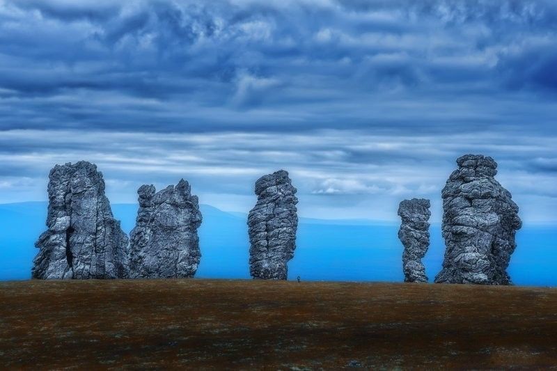 Столбы выветривания Маньпупунёр, известные также как "мансийские болваны", - это уникальный геологический памятник на территории Республики Коми. Группа из семи гигантских каменных останцев высотой с многоэтажный дом создаёт завораживающее зрелище. Шесть исполинов стоят единой группой, а седьмой отстоит от них в стороне.Один из столбов примечателен своей формой, напоминающей опрокинутую бутылку, будто воткнутую в землю неведомой силой. В очертаниях всех скал угадываются мистические образы - то ли фигуры людей, то ли головы животных. Но чаще всего они ассоциируются с древними каменными идолами.