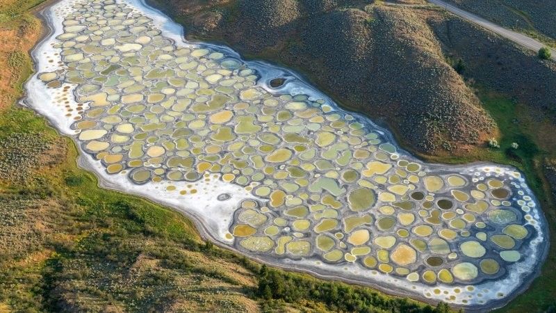 Пятнистое озеро Клилук в Британской Колумбии - это уникальный водоём, насыщенный разнообразными минералами. Летом большая часть воды испаряется, обнажая захватывающую дух картину. По дну озера, словно гигантские пятна на шкуре неведомого зверя, рассыпаны причудливые минеральные образования. Цвет каждого пятна зависит от состава минералов. В летние месяцы эти минеральные отложения твердеют, формируя причудливые узоры и естественные дорожки.