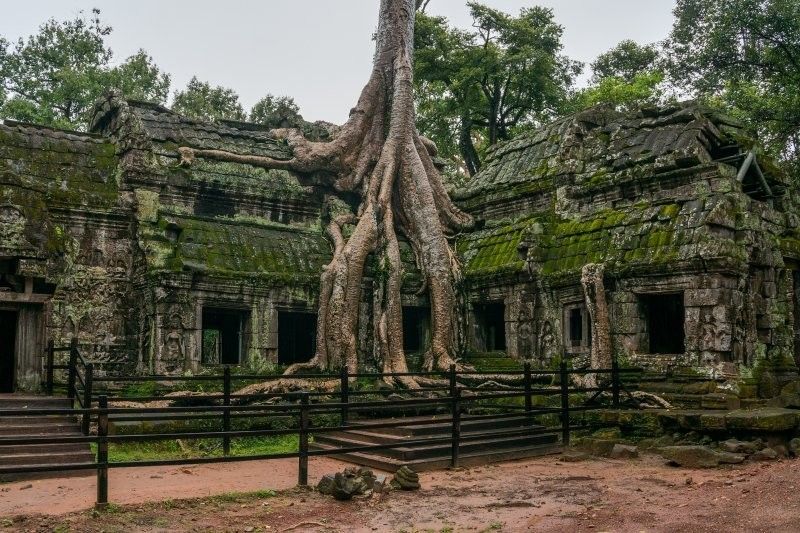 Храм Та Пром представляет собой одно из самых впечатляющих мест в древнем храмовом комплексе Ангкор. Он находится в сердце непроходимых джунглей, и природа буквально душит его своими объятиями. Веками корни деревьев и лианы оплетали стены, галереи и изваяния, неузнаваемо преобразив его облик. На вершине храма сплетение растительности образовало причудливый и завораживающий природный купол.