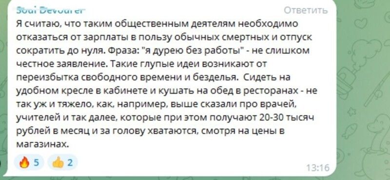 Ранее председатель Госдумы Вячеслав Володин также предлагал сократить продолжительность отпусков для чиновников и депутатов до минимальных норм, установленных трудовым законодательством, чтобы обеспечить эффективную работу органов власти в текущих условиях. Сейчас депутаты отдыхают 42 дня в году, а максимальный отпуск госслужащих составляет 45 дней.