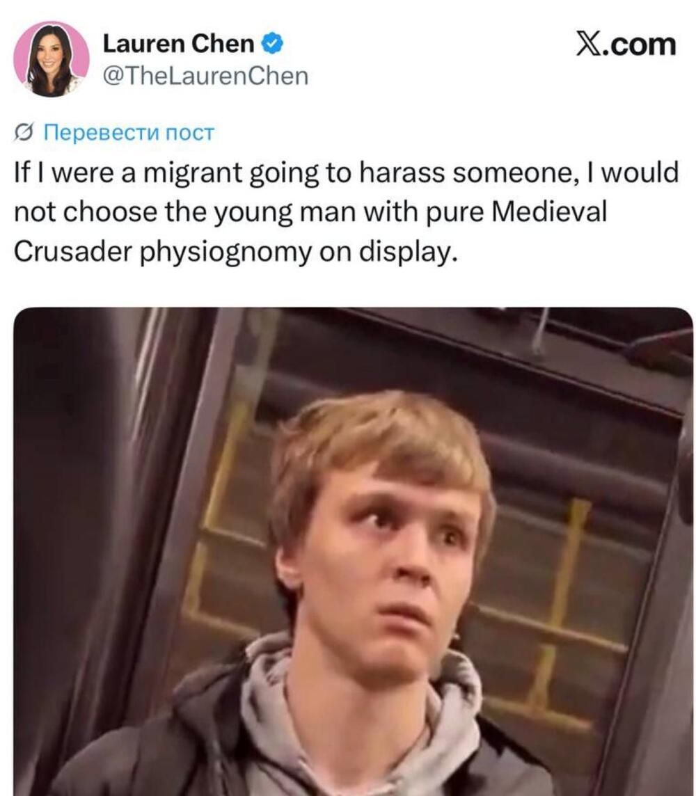 Сперва ещё раз посмотрим это эпичное видеоИзвестная канадская блогерша Лорен Чен с сотнями тысяч подписчиков обратила внимание на парня. Она подумала, что дебошир был мигрантом, а парень человеком, который устал от произвола. В нём она увидела средневекового рыцаря."Я бы не стала шутить с человеком, физиономия которого похожа крестоносца"