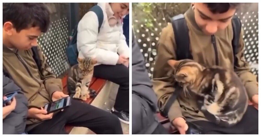 Маленький кот протянул лапку, едва касаясь парня, словно спрашивая: "Можно?" - и, получив молчаливое одобрение, уютно устроился у него на коленях.