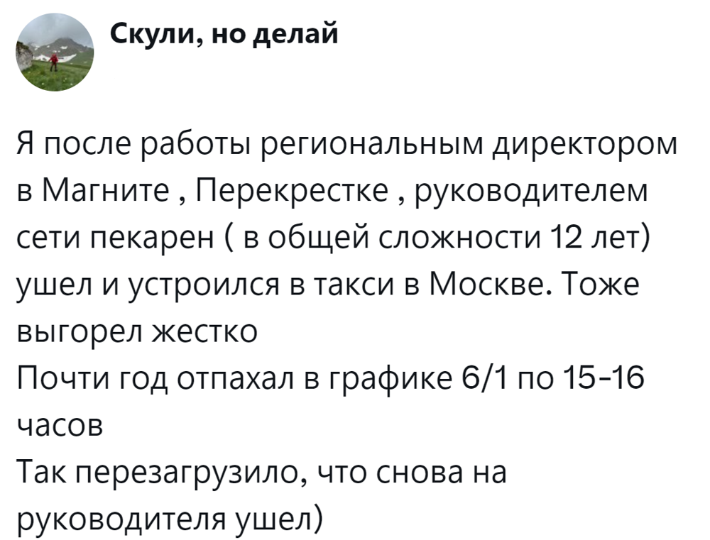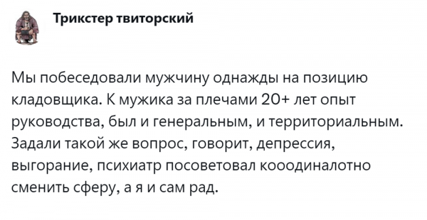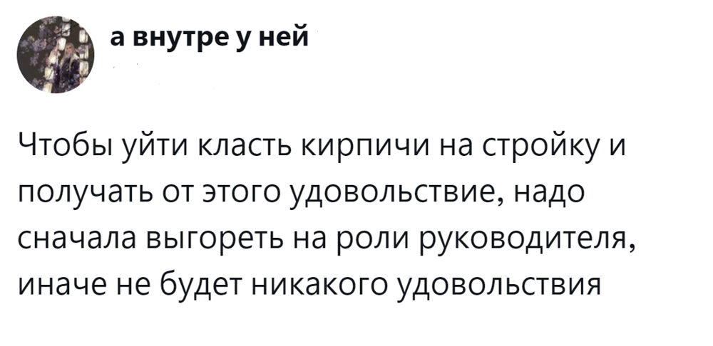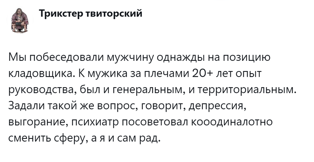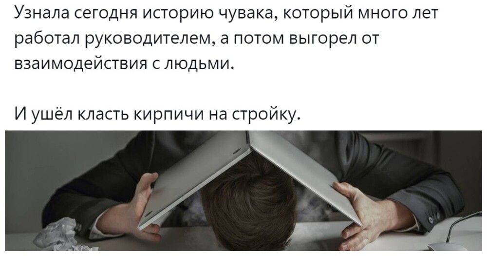 Обладающие её должным запасом люди успевают работать в режиме многозадачности, делают головокружительную карьеру, добиваются руководящих должностей, а потом... идут в дворники. И это не образное выражение. В жизни действительно немало примеров, когда успешные руководители настолько выгорают, что чуть ли не в тайгу уезжают. Или идут в дворники и становятся абсолютно счастливыми. Пользователи рассказали о таких случаях и попытались разобраться в причинах профессионального выгорания.
