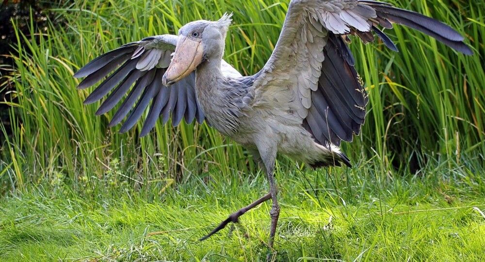 Китоглавы любят стоять на одной ноге, но сперва им приходится осваивать этот навык. Получается у птиц это с переменным успехом.